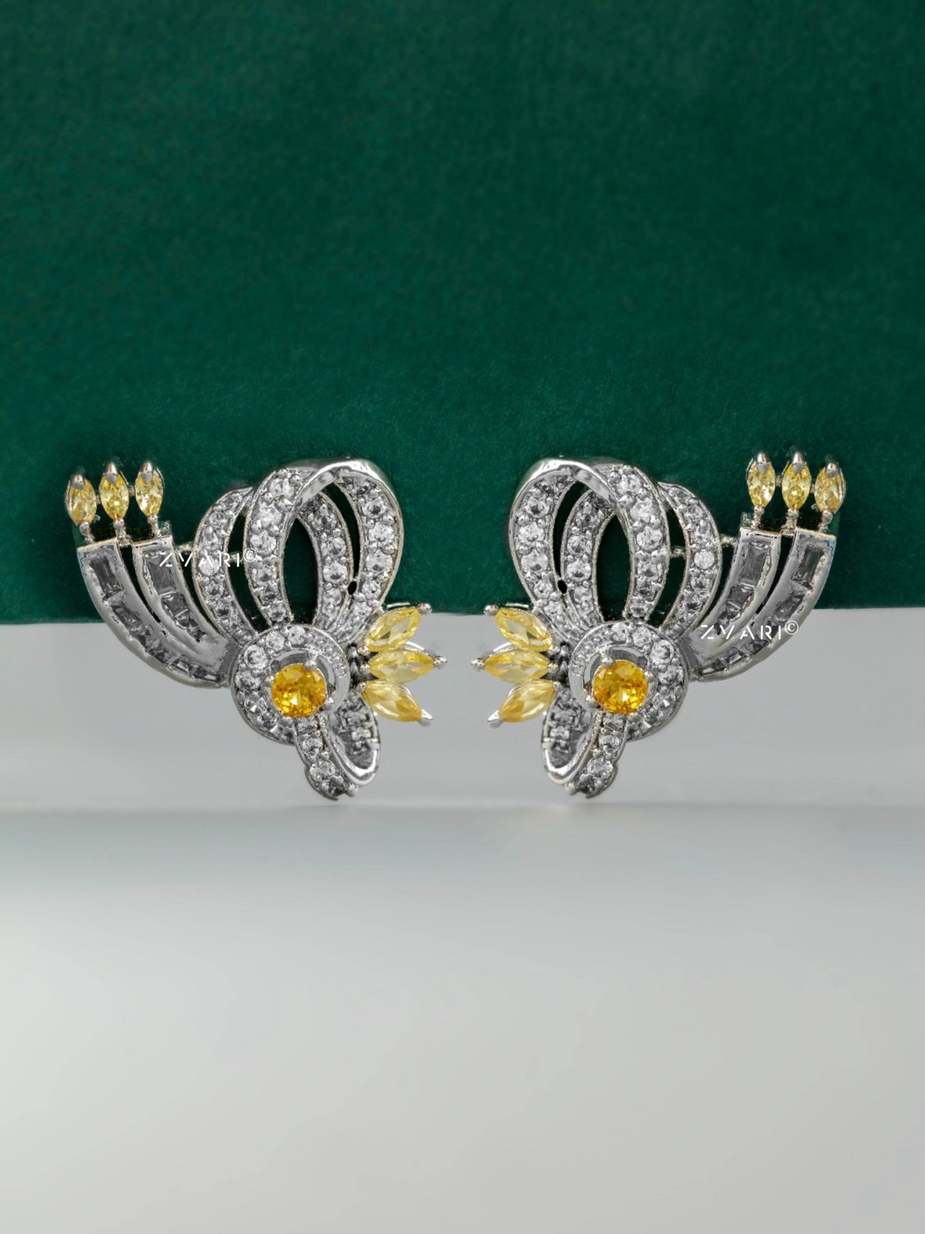 These exquisite Zvari earrings are a modern classic infused with graceful glamour. Crafted in rhodium-plated metal, they feature intricately looping curves encrusted with dazzling zirconia that create a luxurious, ribbon-like silhouette. Accents of yellow marquise-cut and round stones bloom like delicate floral bursts, adding a soft yet radiant contrast. The overall design exudes elegance with a playful edge — perfect for occasions that call for refined sophistication and a touch of sparkle.