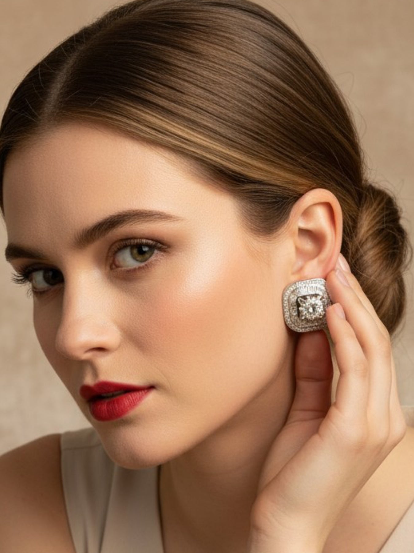 Izan is meticulously hand-set with Swarovski stones, known for their unmatched brilliance and clarity. Its cushion-square silhouette, framed with baguette and round cuts, radiates timeless glamour — from day to soirée.