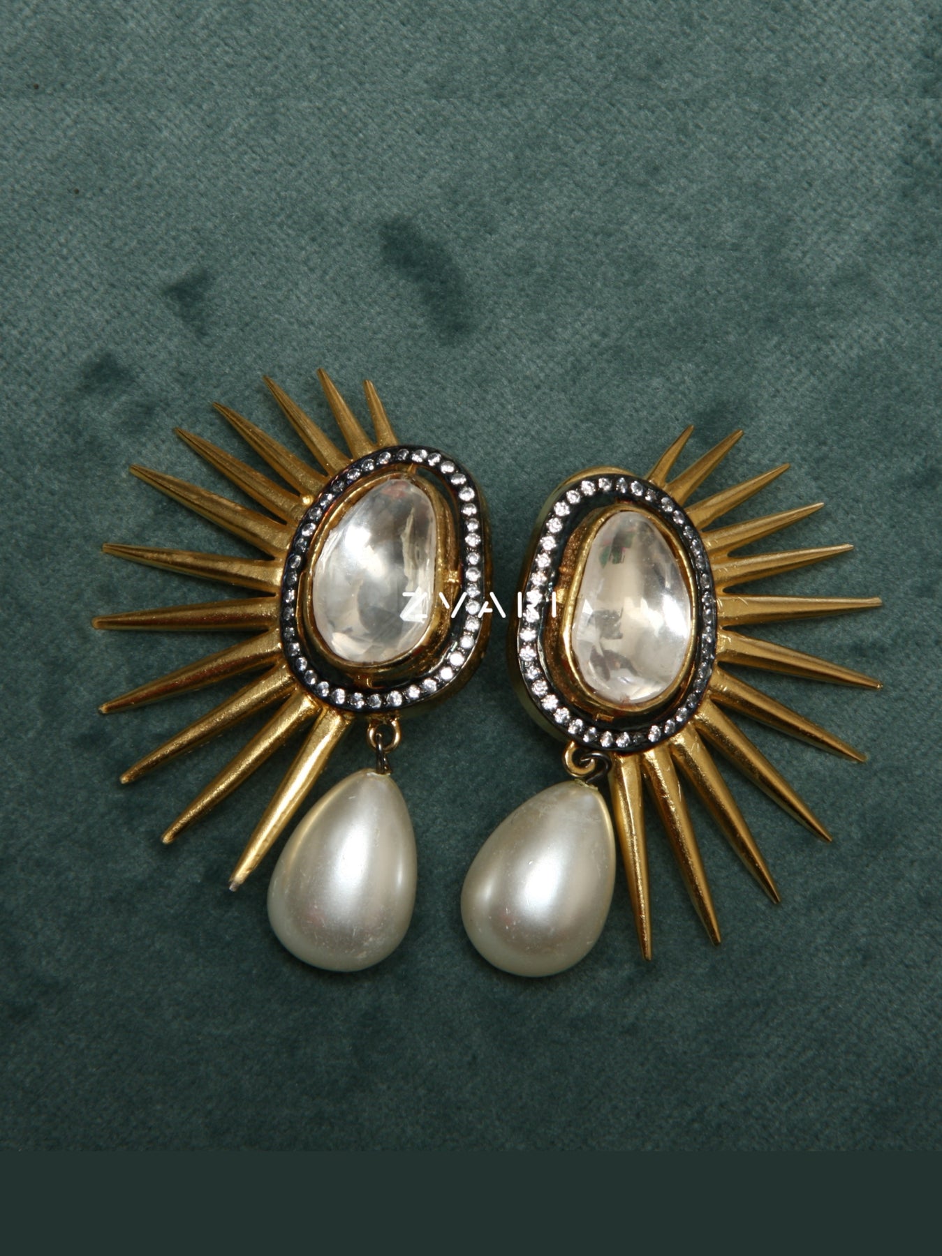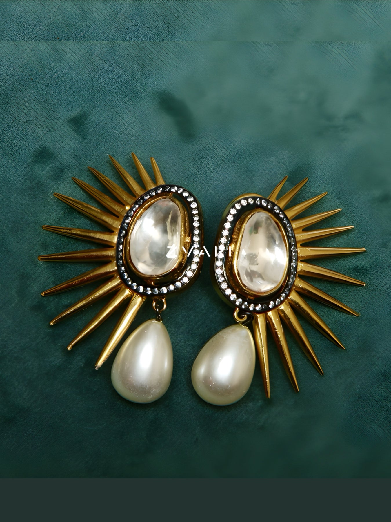 Striking and sculptural, these spikey studs fuse tradition with edge — featuring Kundan in rich gold polish and American diamonds in rhodium-black finish. Finished with delicate pearl drops, they’re a bold yet elegant statement.