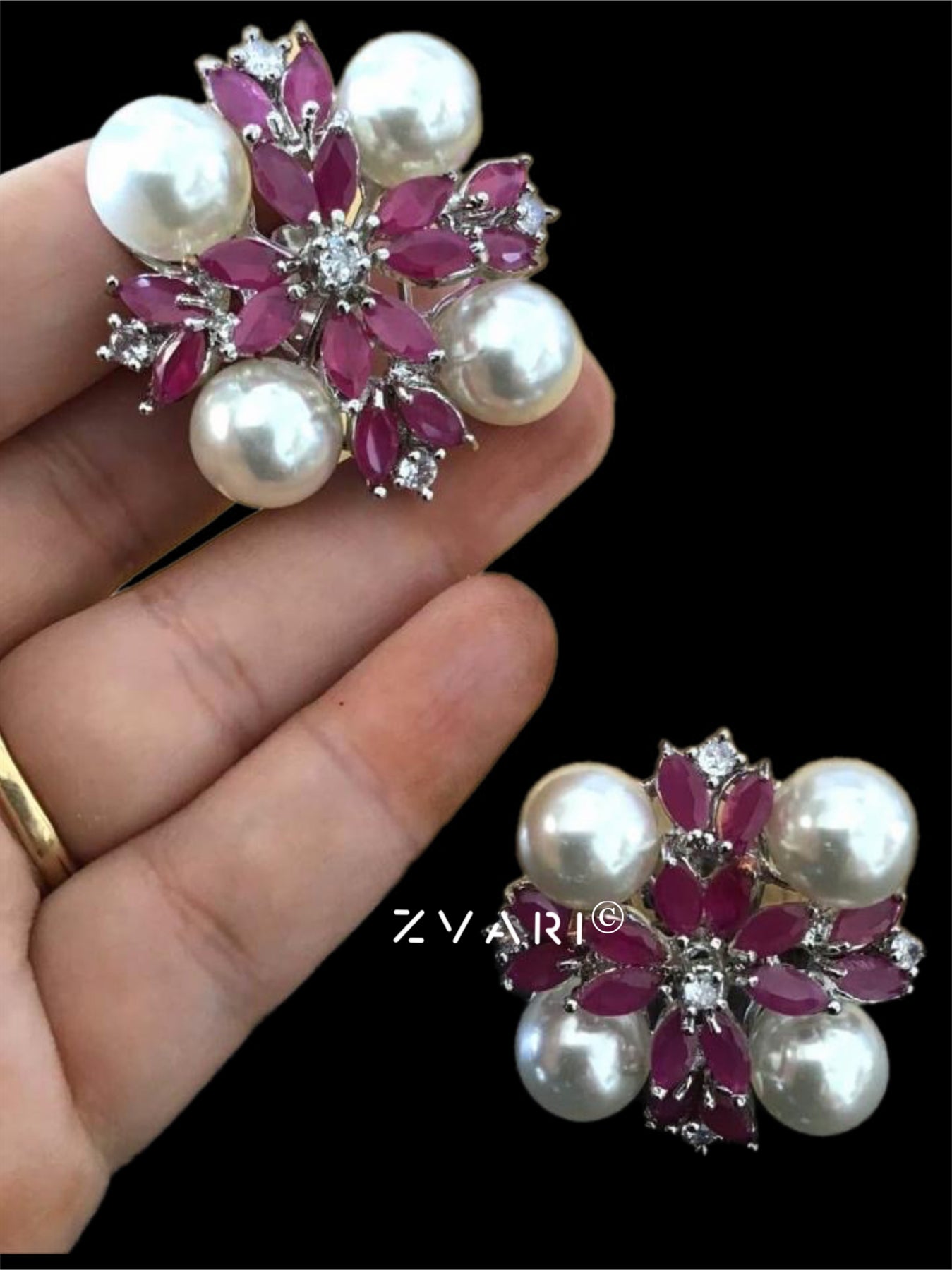 The sparkling elegance of these pearls, sapphire/ruby alike stones and zircons will last forever, crafted in lustrous rhodium polish.
