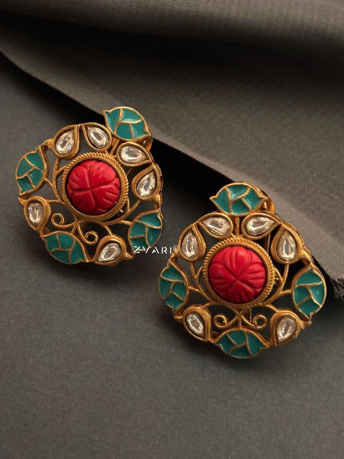 Shop our exquisite Fusion Studs, crafted with a blend of Polki Kundan, carved stone, and hand-painted enamel. These studs are truly one-of-a-kind, combining traditional craftsmanship with a modern touch. The intricate details and vibrant hues make them the perfect statement piece for any occasion!