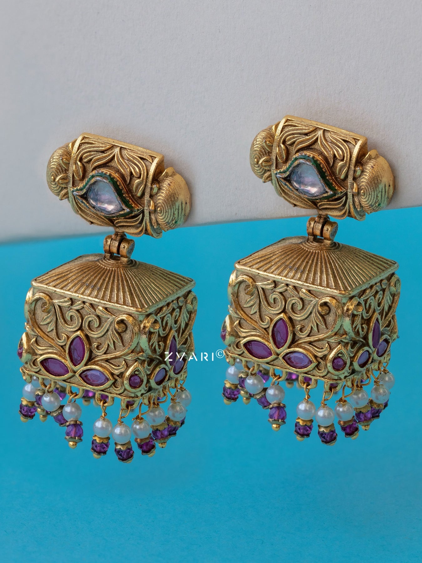 Beautiful self carved gold-plated jhumkas with ruby hue stones which are approximately 2.25 inches long