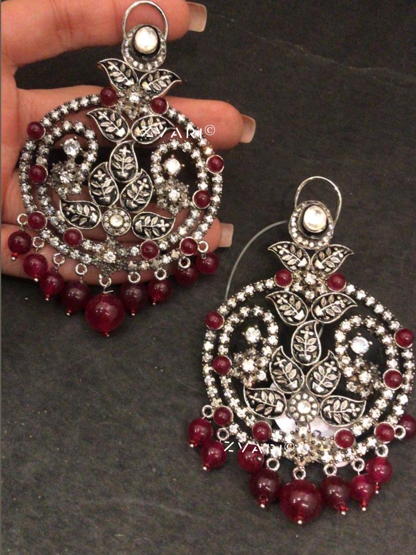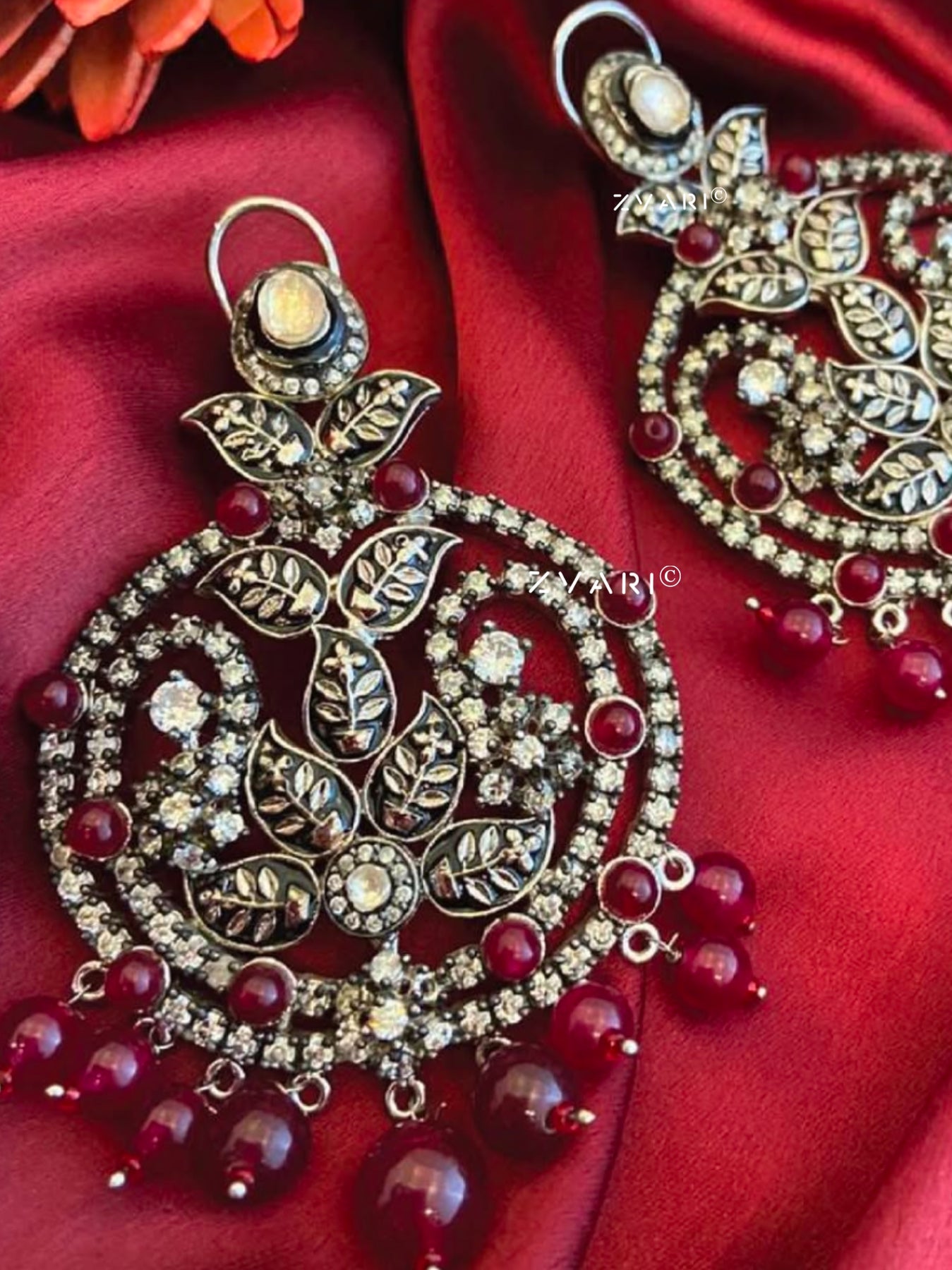These earrings features the brilliance of Kundan and American diamonds, meticulously crafted with self-carved leaf motifs. Finished in a striking silver-black polish, it radiates elegance with a contemporary twist.