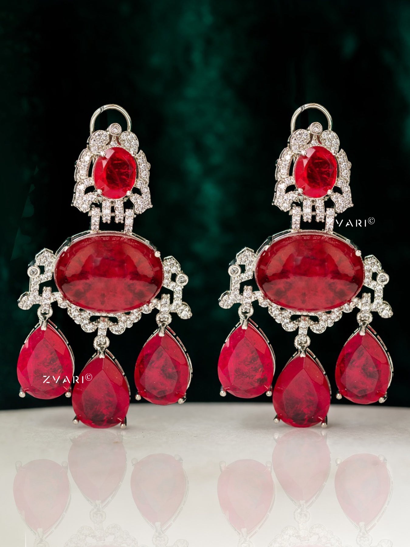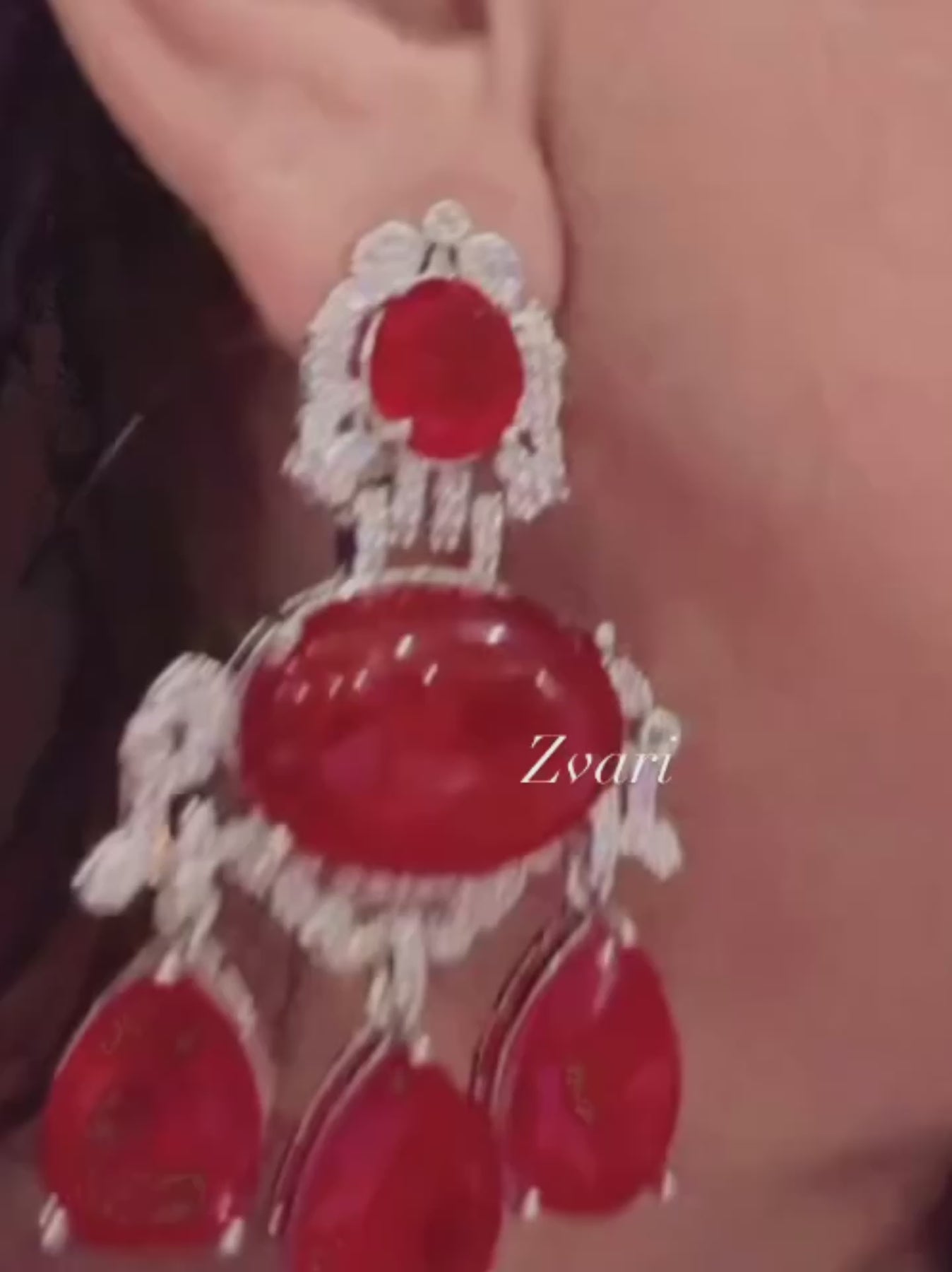 These statement earrings from Zvari are a bold fusion of glamour and artistry. Crafted with striking ruby-hued doublet stones, the design features a dramatic tiered structure: an oval-cut centerpiece accented by pavé-set zircons, leading to a trio of pear-shaped drops that catch the light with every movement. The upper crest is crowned with a smaller ruby doublet, encased in a vintage-inspired halo.