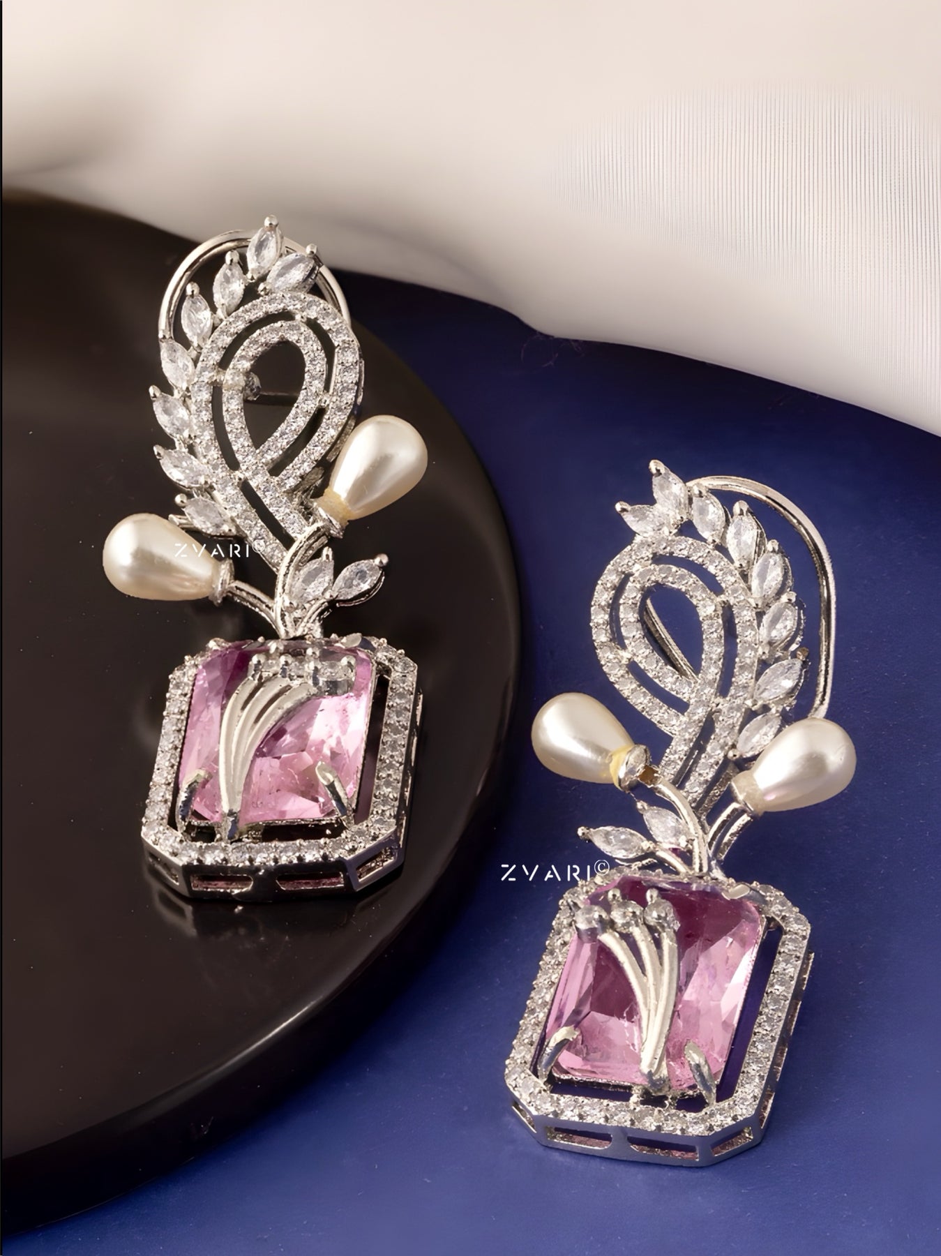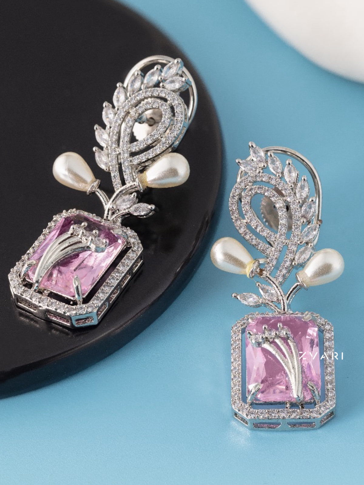 Zvari has created the ultimate timeless and elegant earrings for both daytime and evening attire featuring brilliant soft hue pink crystal on a silver tone setting with studded Zircons and pearls