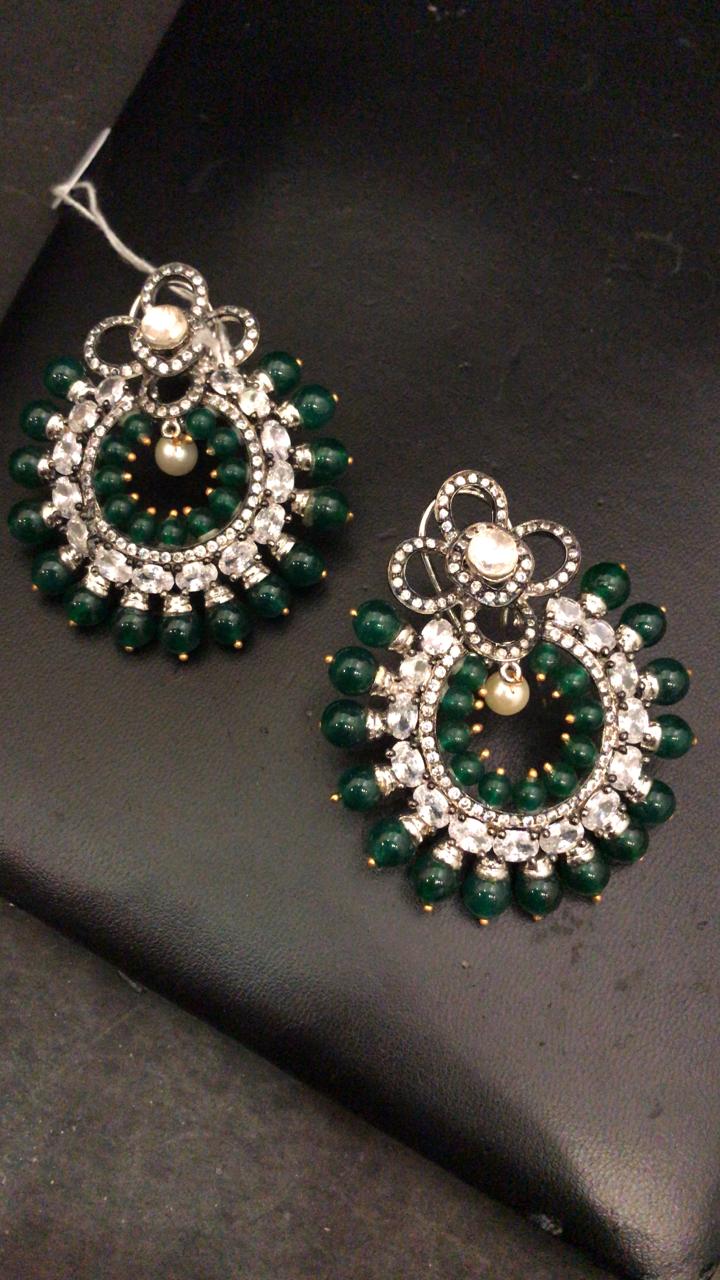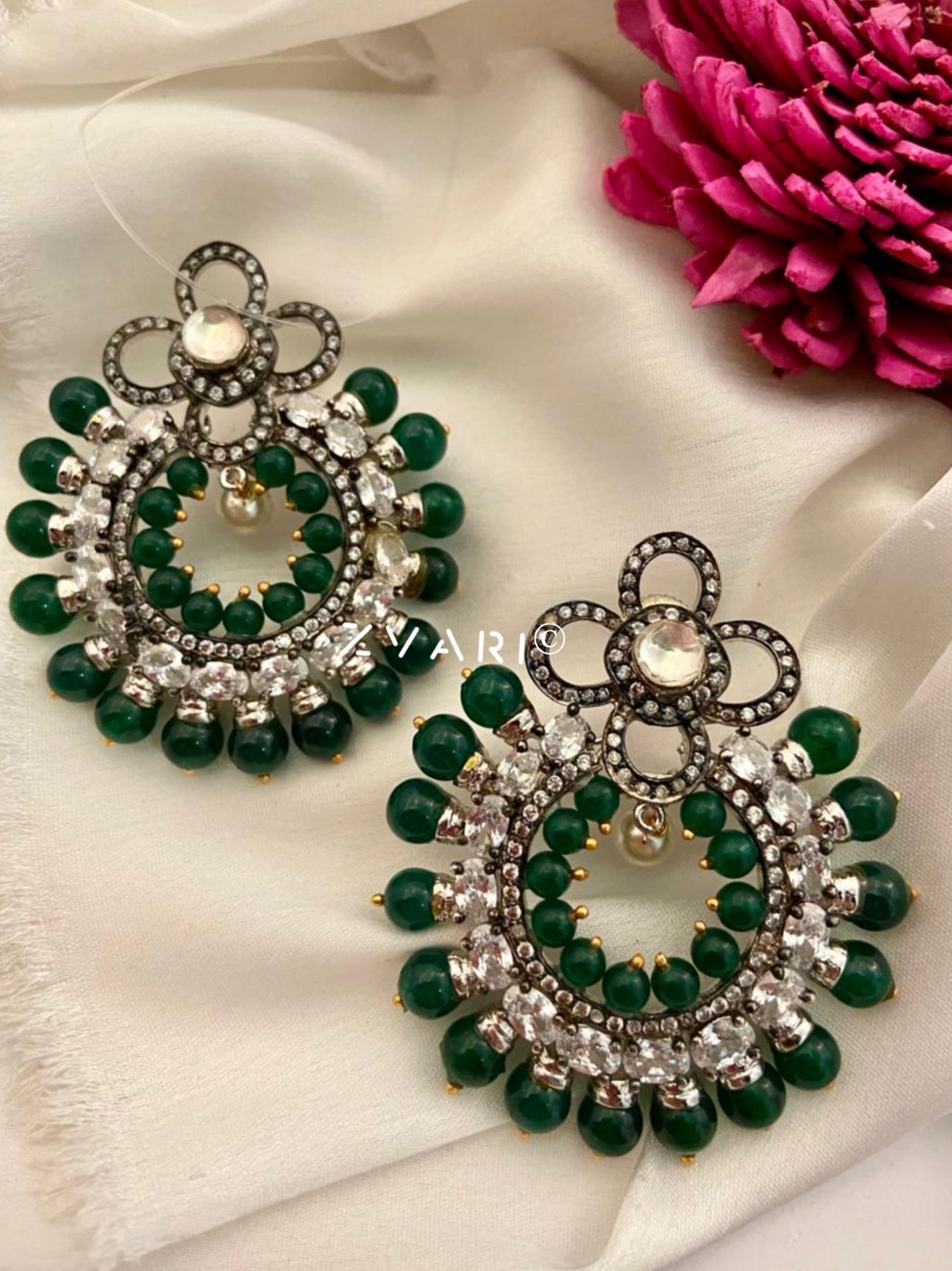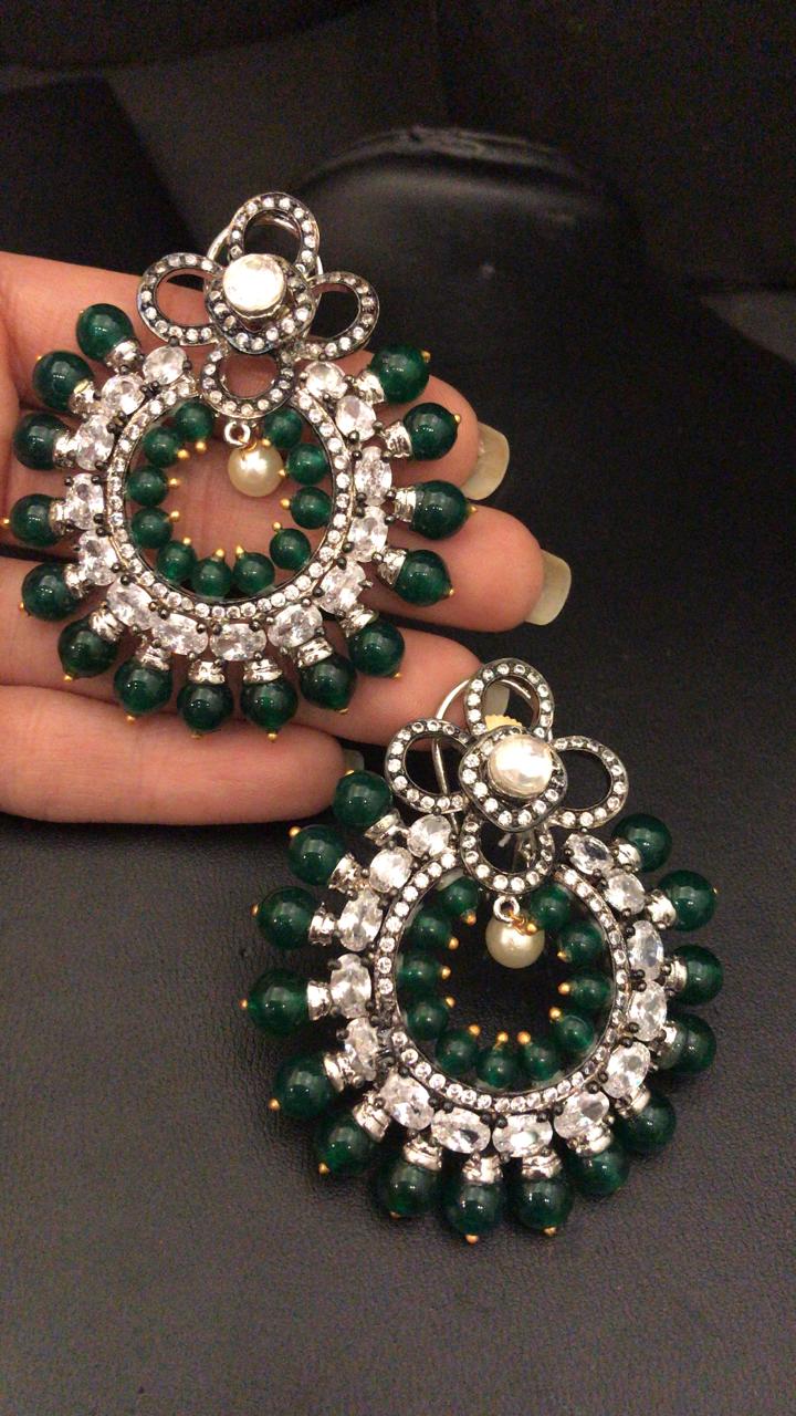 A striking chandbali design adorned with rich emerald green beads, shimmering crystals, and a delicate pearl accent. The circular silhouette, framed with intricate detailing, makes Ozzie the perfect statement for weddings, festive wear, or an elegant evening out.