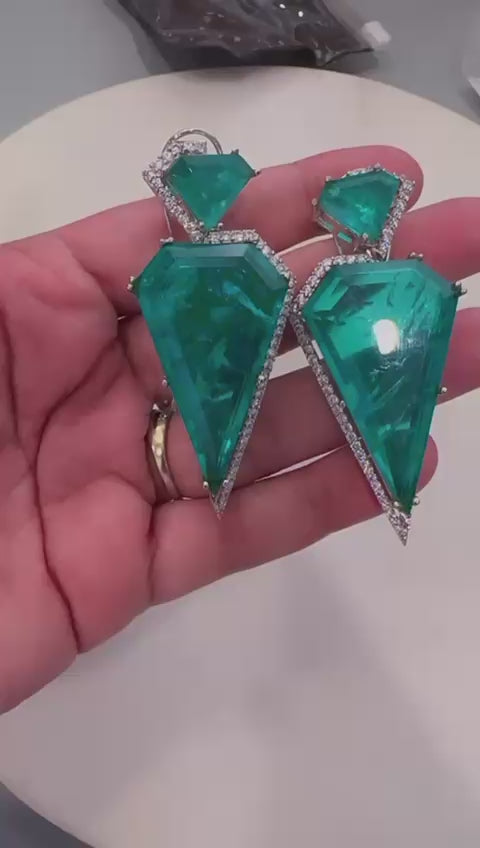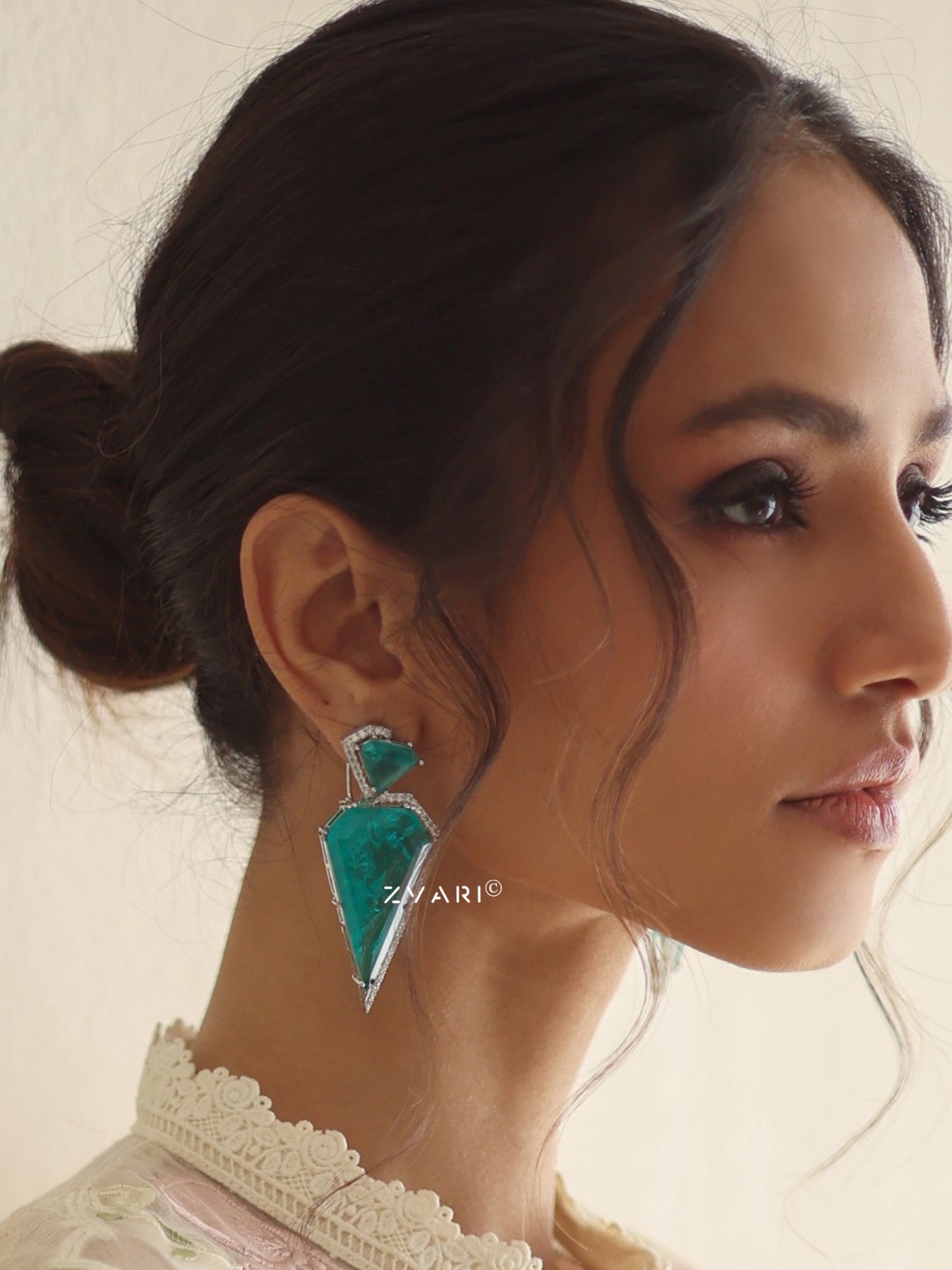 Make a statement with these Teal doublet earrings with American diamonds on the edges, approximately 3 inches in length.