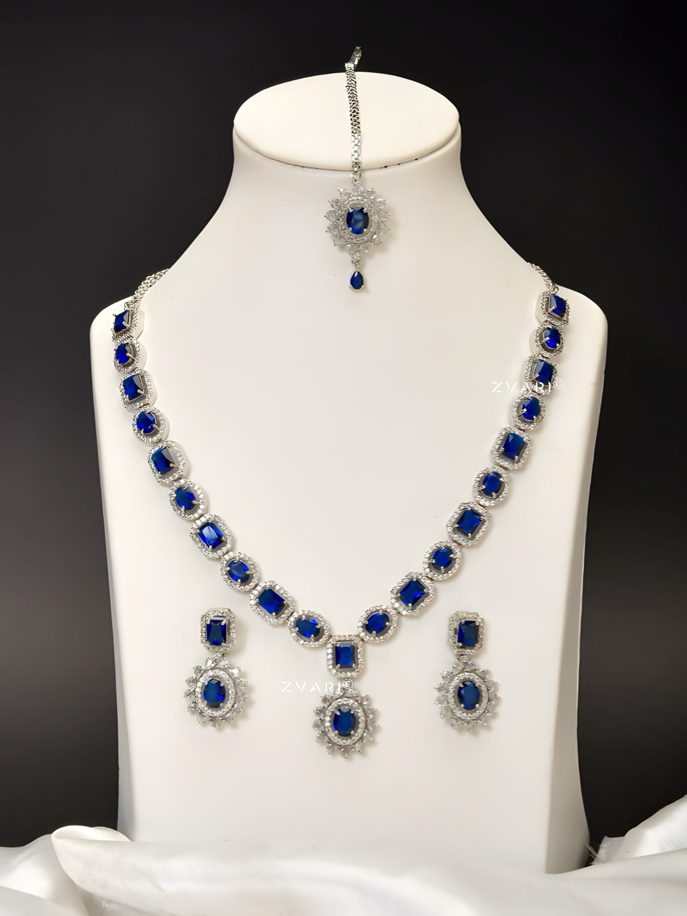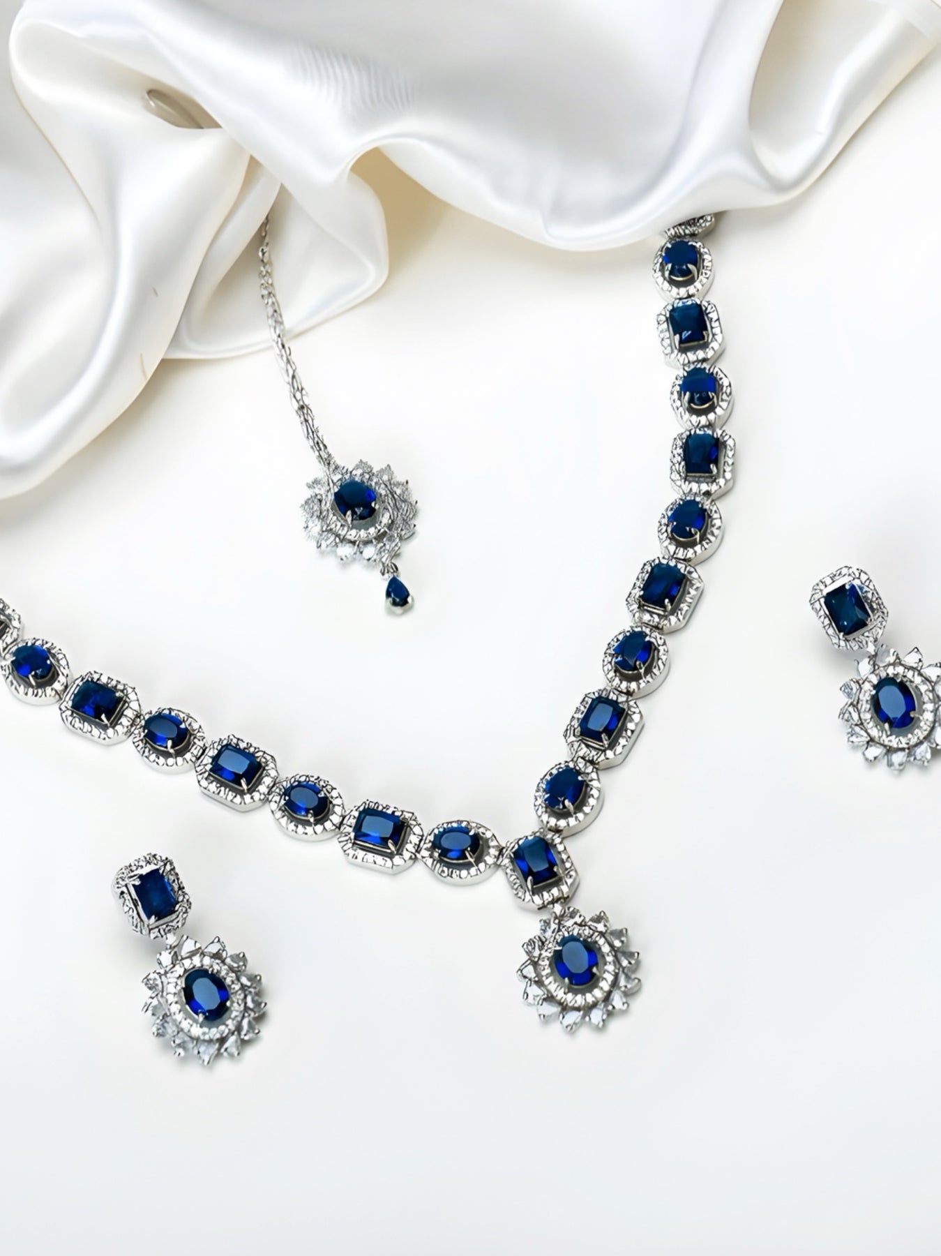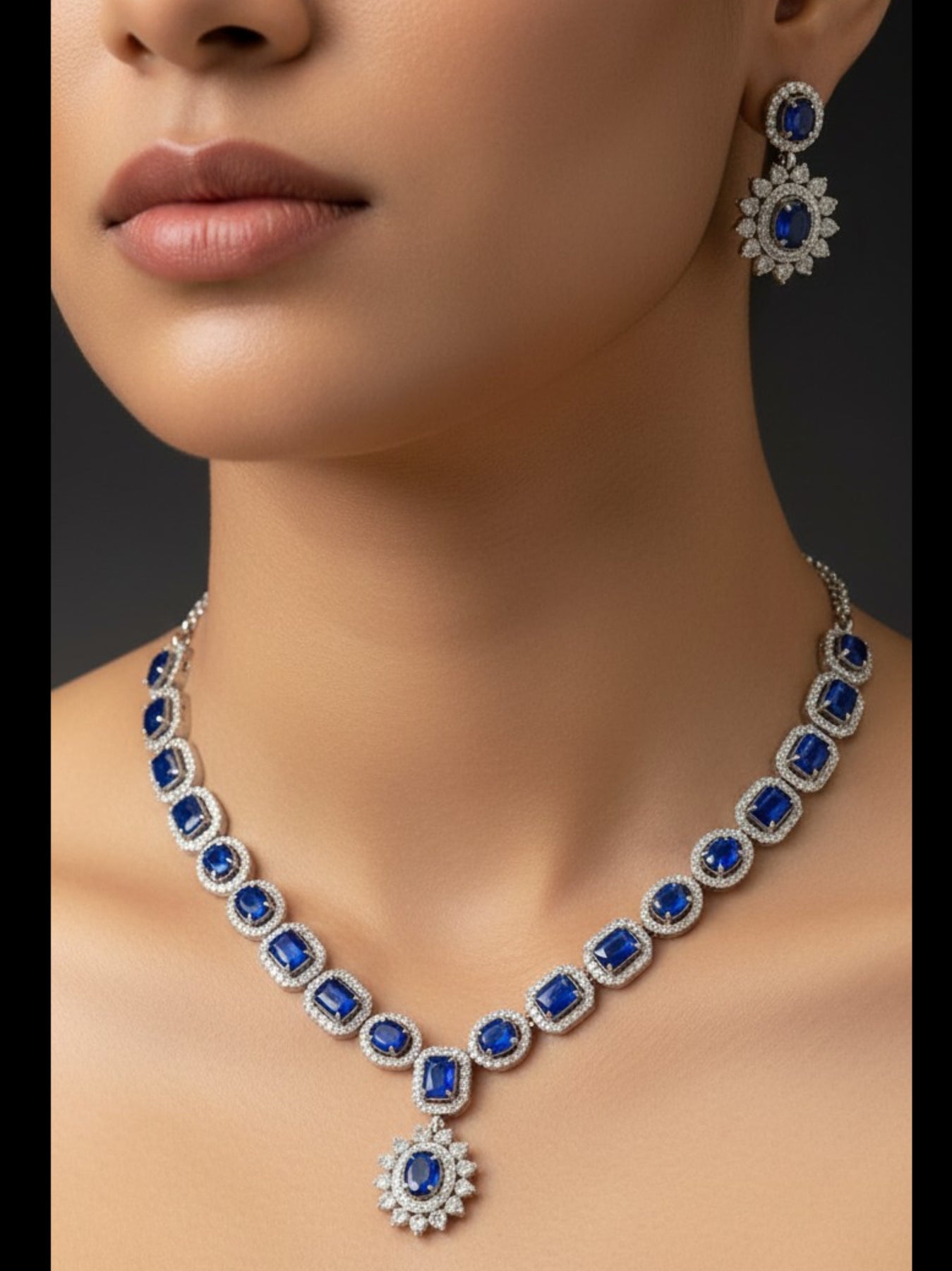 The Natalya Set embodies timeless allure — crafted in rhodium plating and adorned with striking sapphire-hued stones encircled by delicate zircon halos. Its graceful design captures the essence of royalty with a modern edge, making it the perfect choice for evening affairs and special occasions. A statement in every sense — refined, radiant, and endlessly elegant.