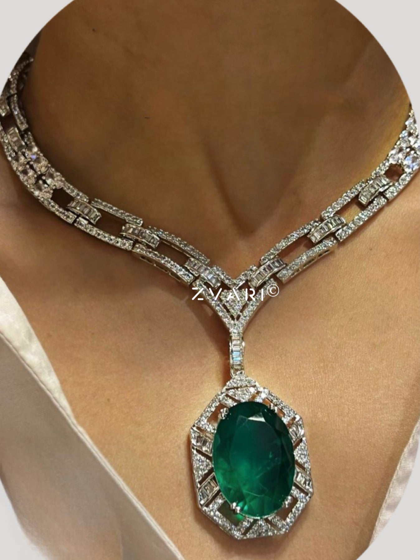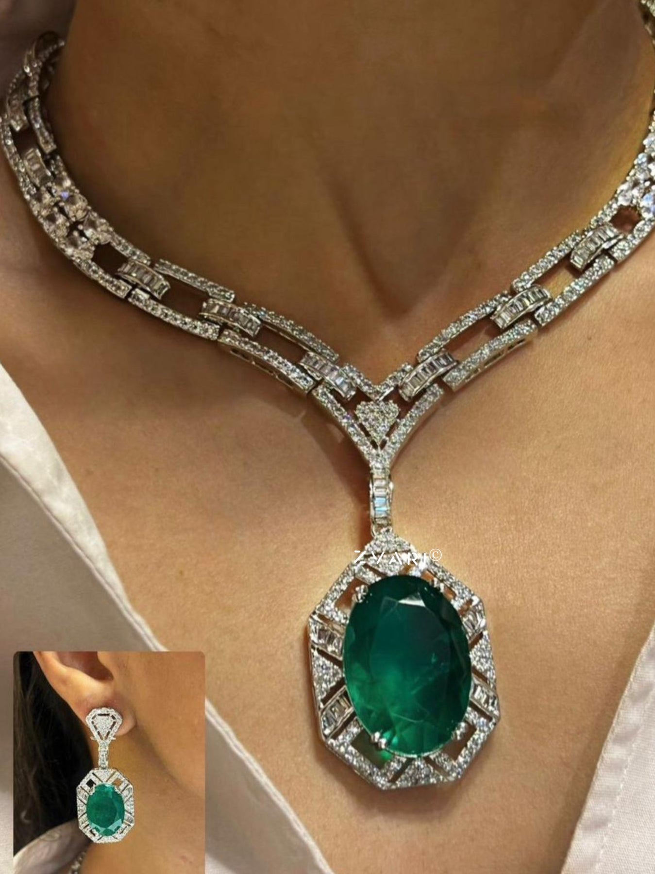 The round-cut gemstone are enhanced by shimmering American diamond accents in this gorgeous pendant necklace and matching drop earrings Jewellry set.