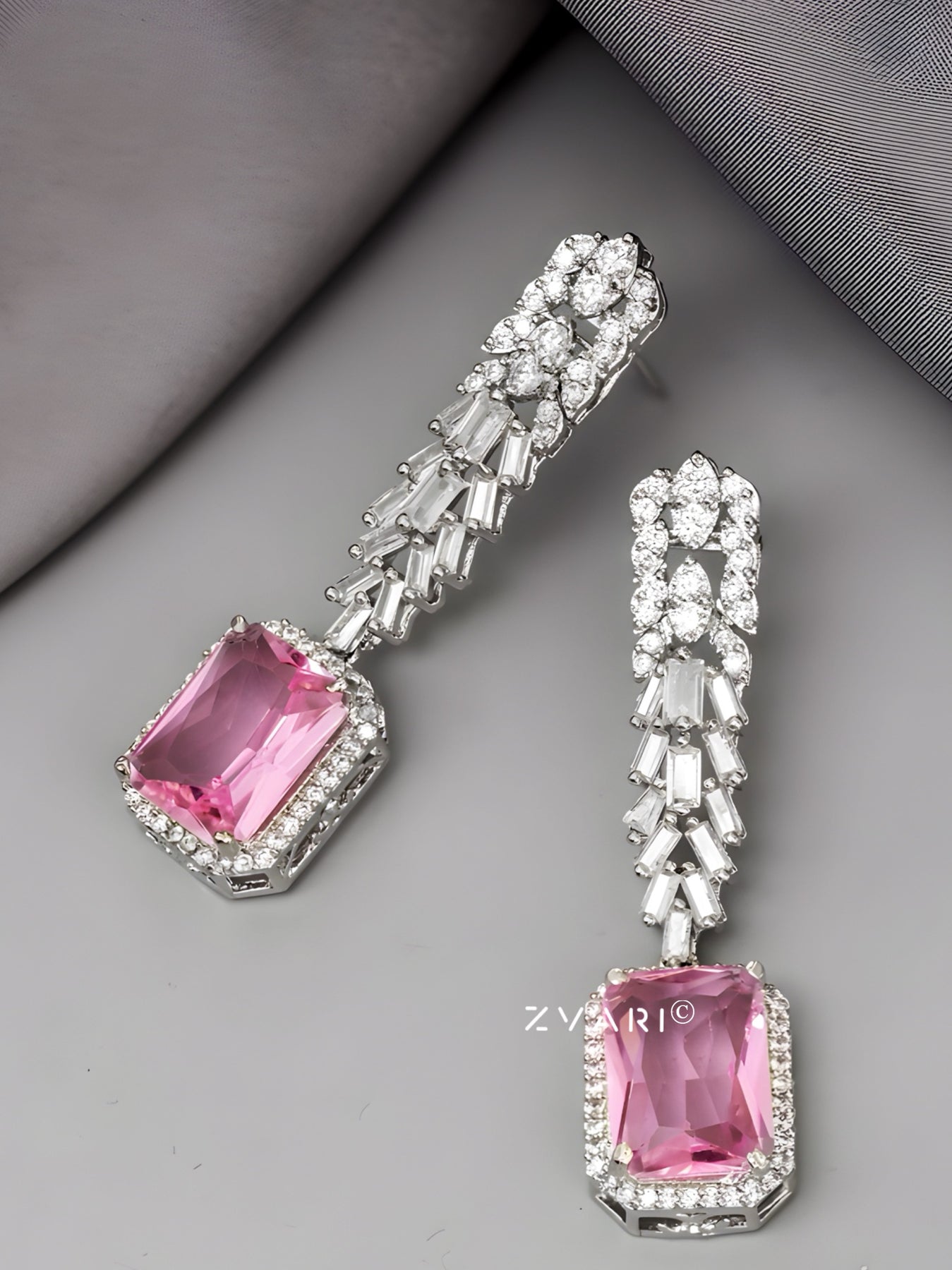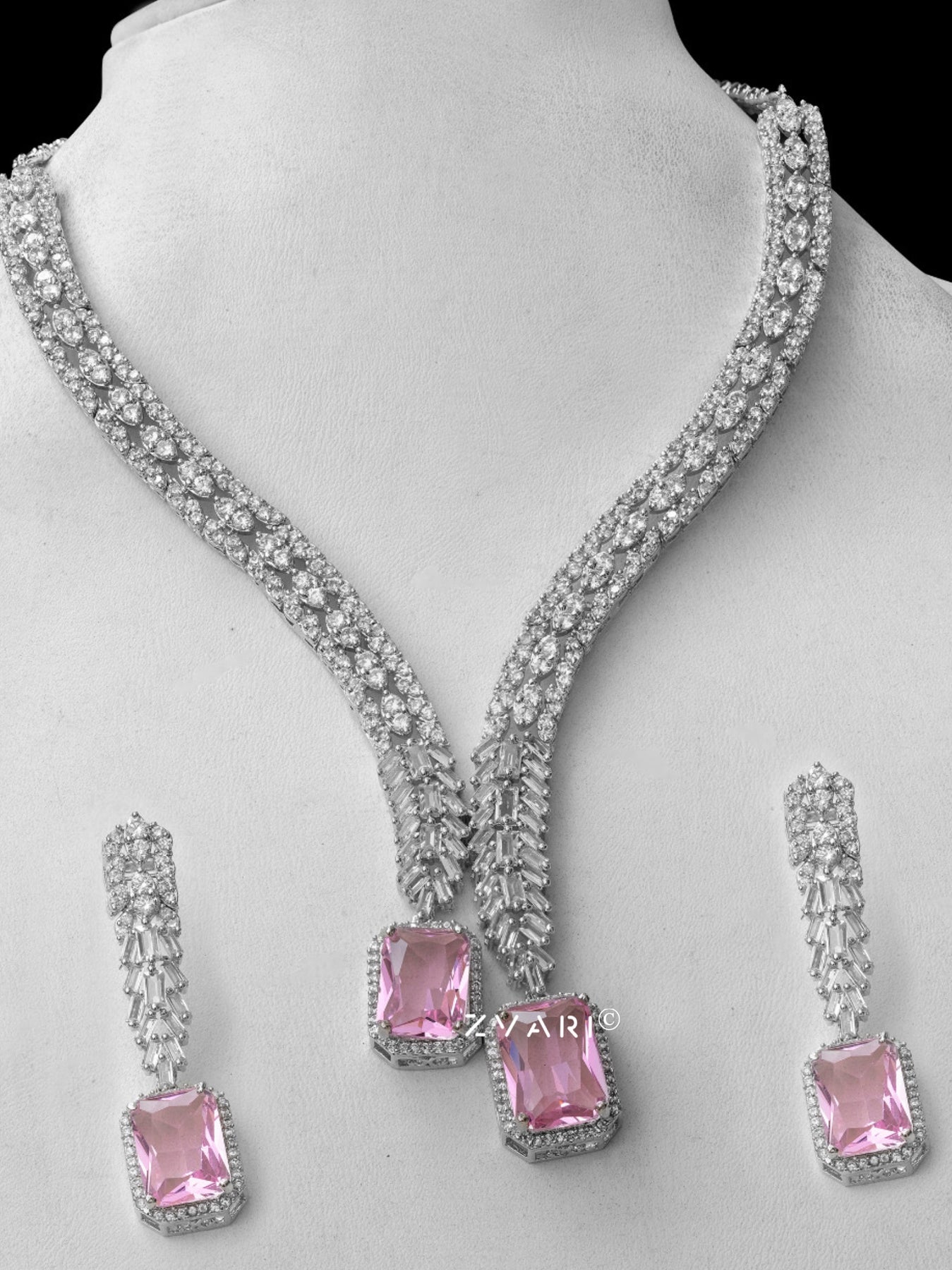 Feel pretty in the pink glow of this pink square crystals with shinny zirconia necklace and earrings