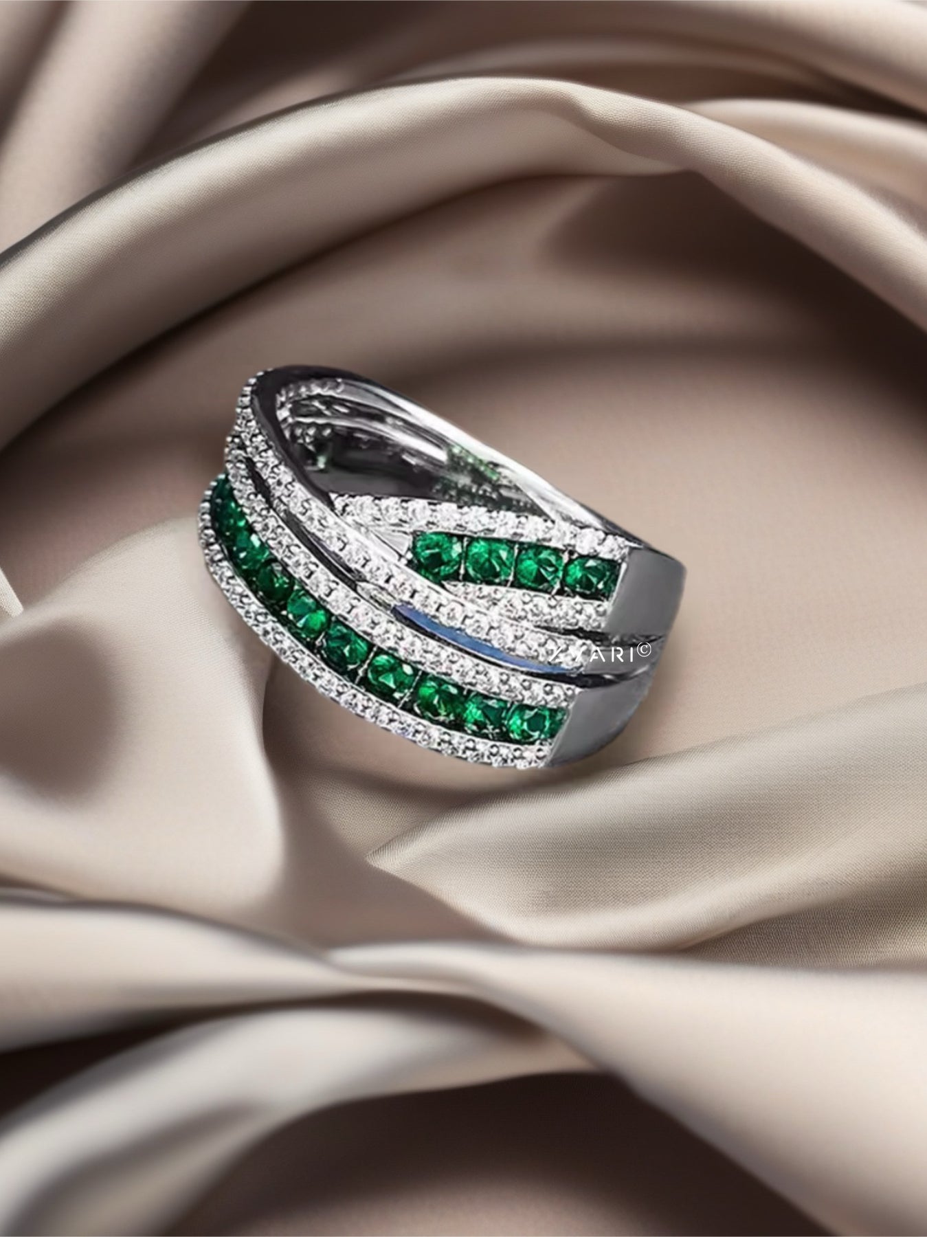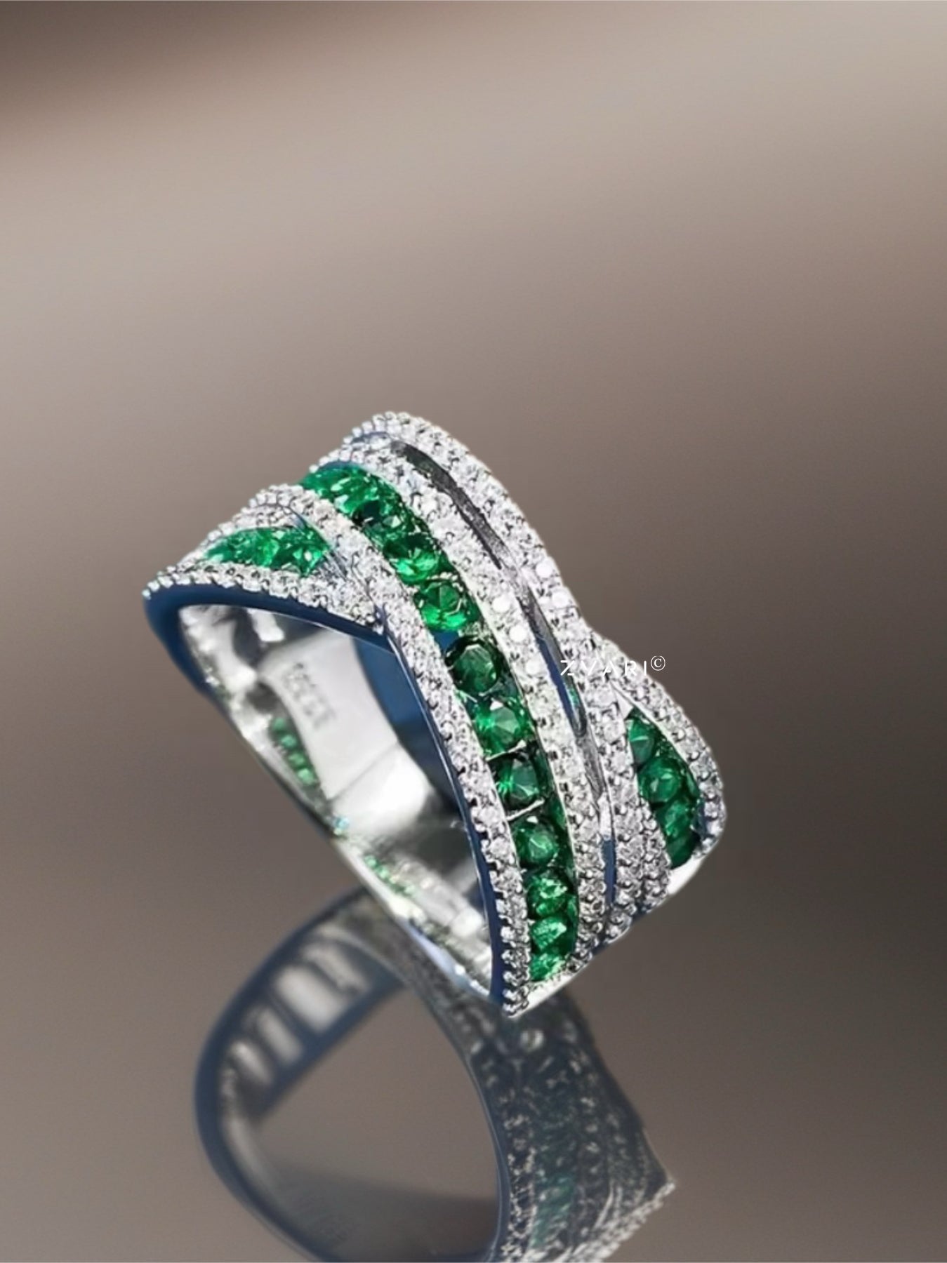 Gracefully entwined in 92.5 sterling silver with a lustrous rhodium finish, the Emeris Ring radiates modern sophistication. Its fluid crossover bands are adorned with fine-cut emerald-green and white cubic zirconia, creating a captivating play of brilliance and depth.