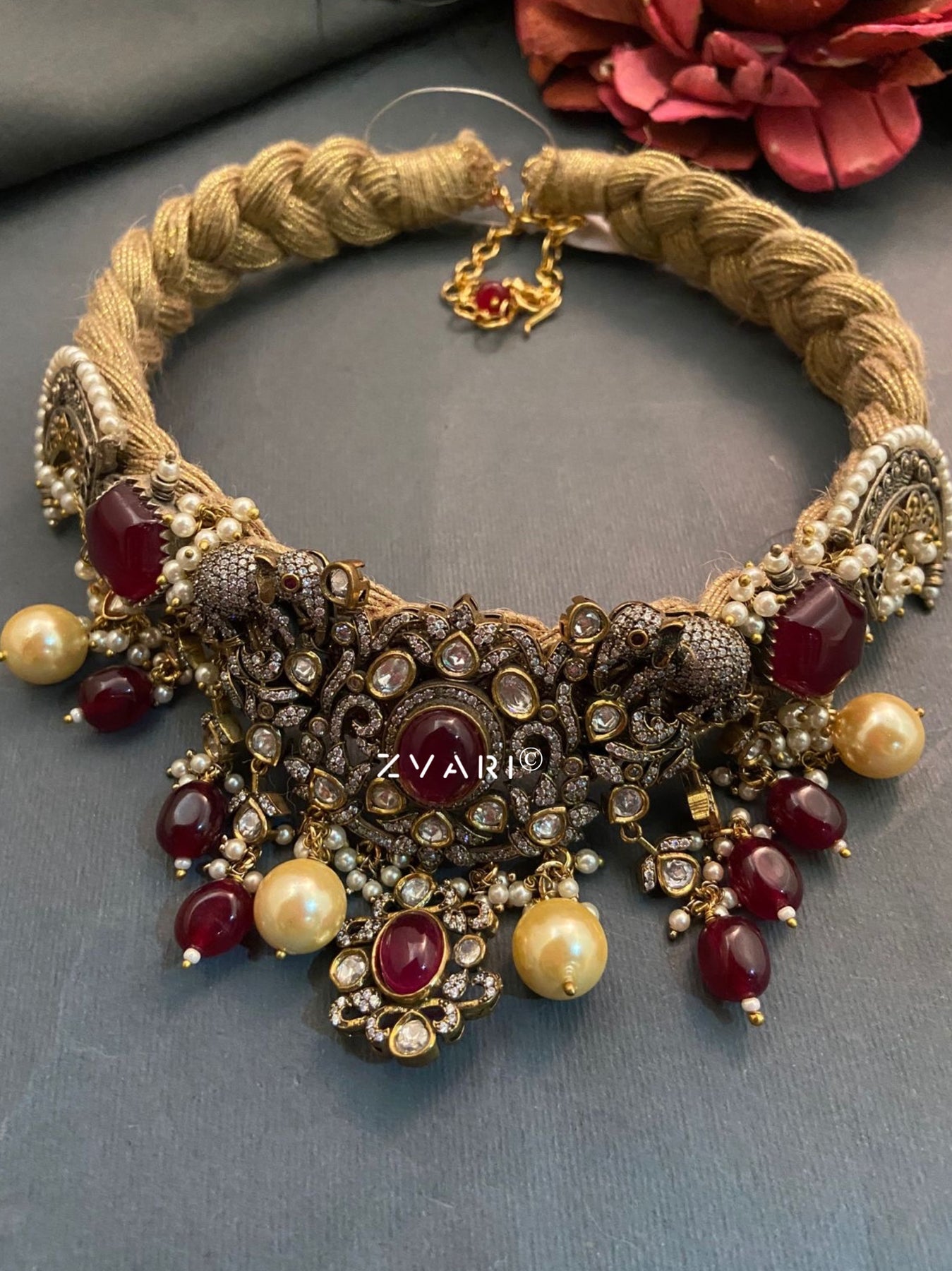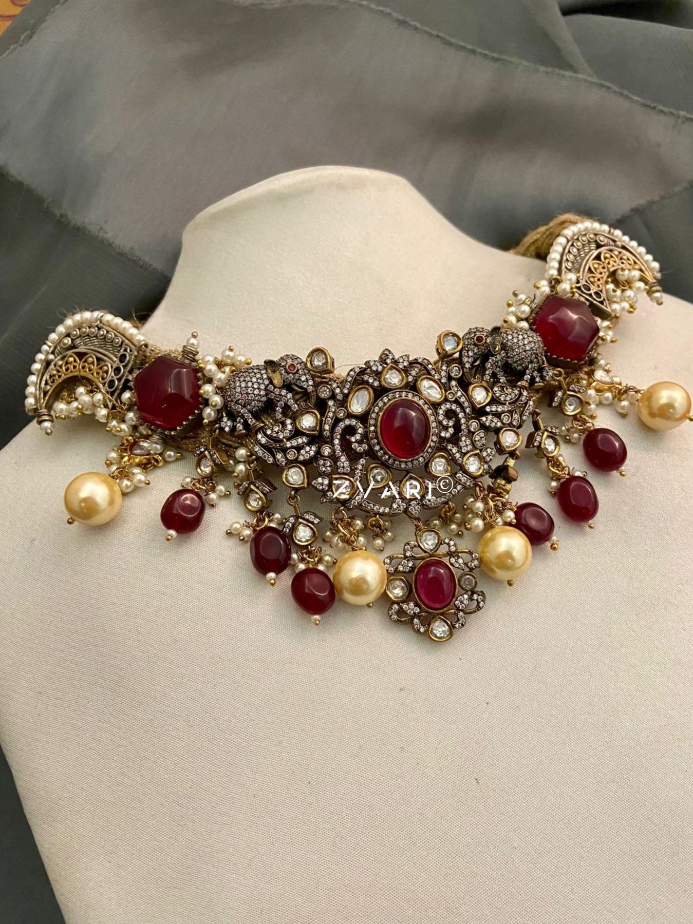 Glamour radiant from this stunning vintage inspired kundan, American diamonds and deep crimson stones to make this gorgeous necklace