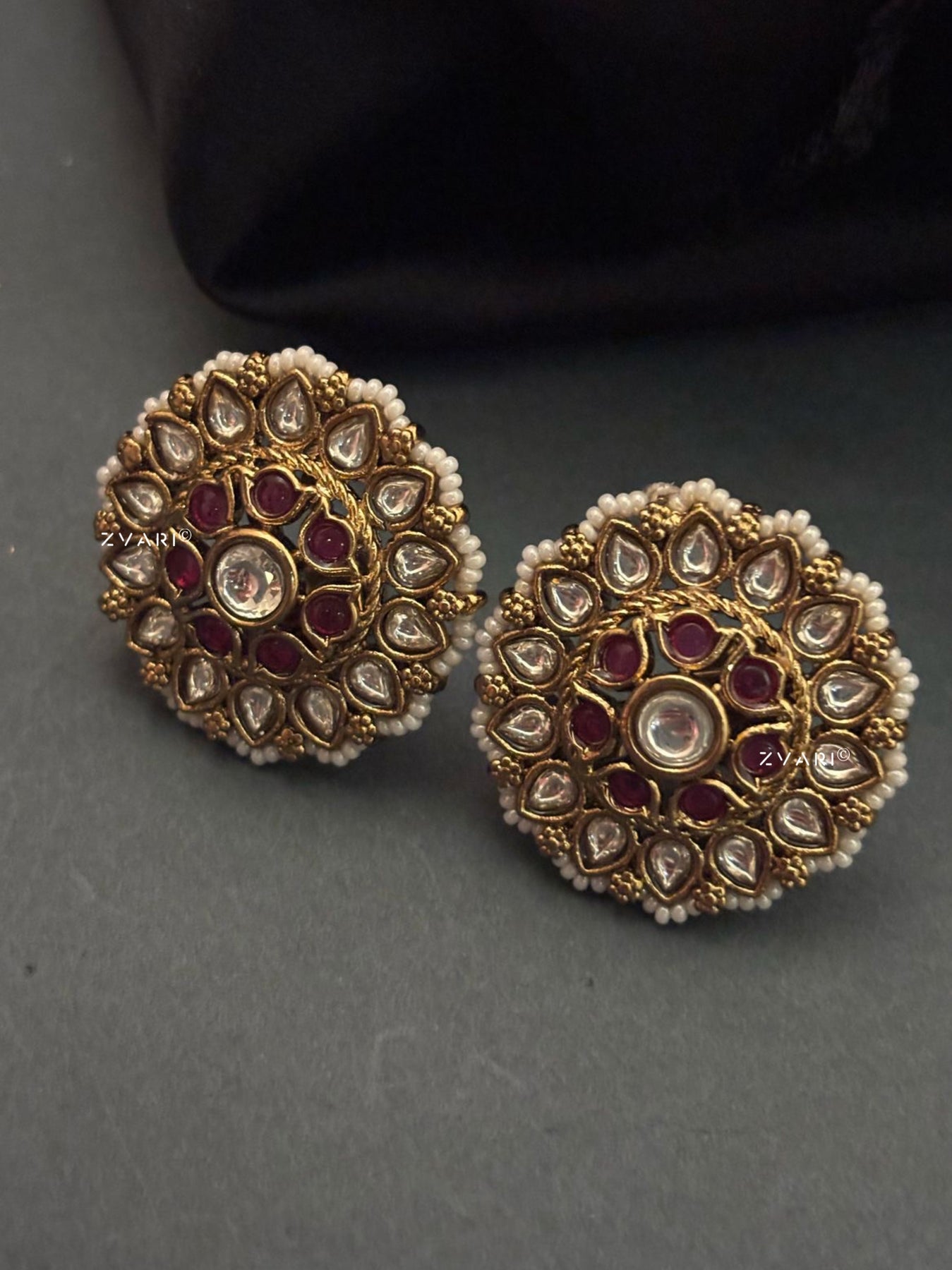 Rooted in the soul of tradition, Roohi is a poetic rendition of classic Jadau craftsmanship. These 1.25 inch floral studs, intricately set with uncut-style kundan and vibrant meenakari in ruby and emerald tones, are framed with hand-strung pearls for a finish that feels both regal and intimate. Designed to echo the elegance of heirloom treasures, Roohi is the kind of piece that transcends time — rich in detail, yet effortless in presence.