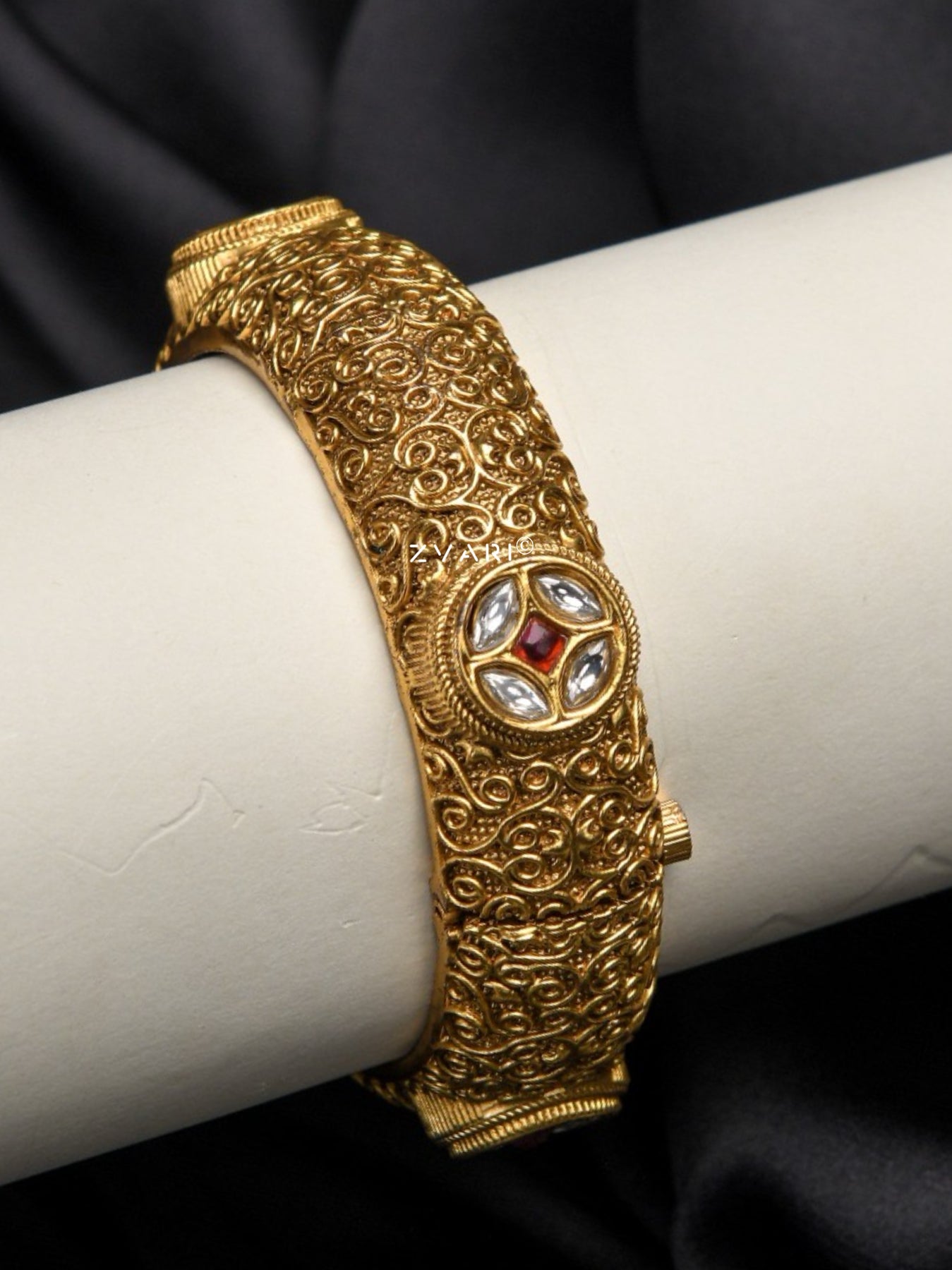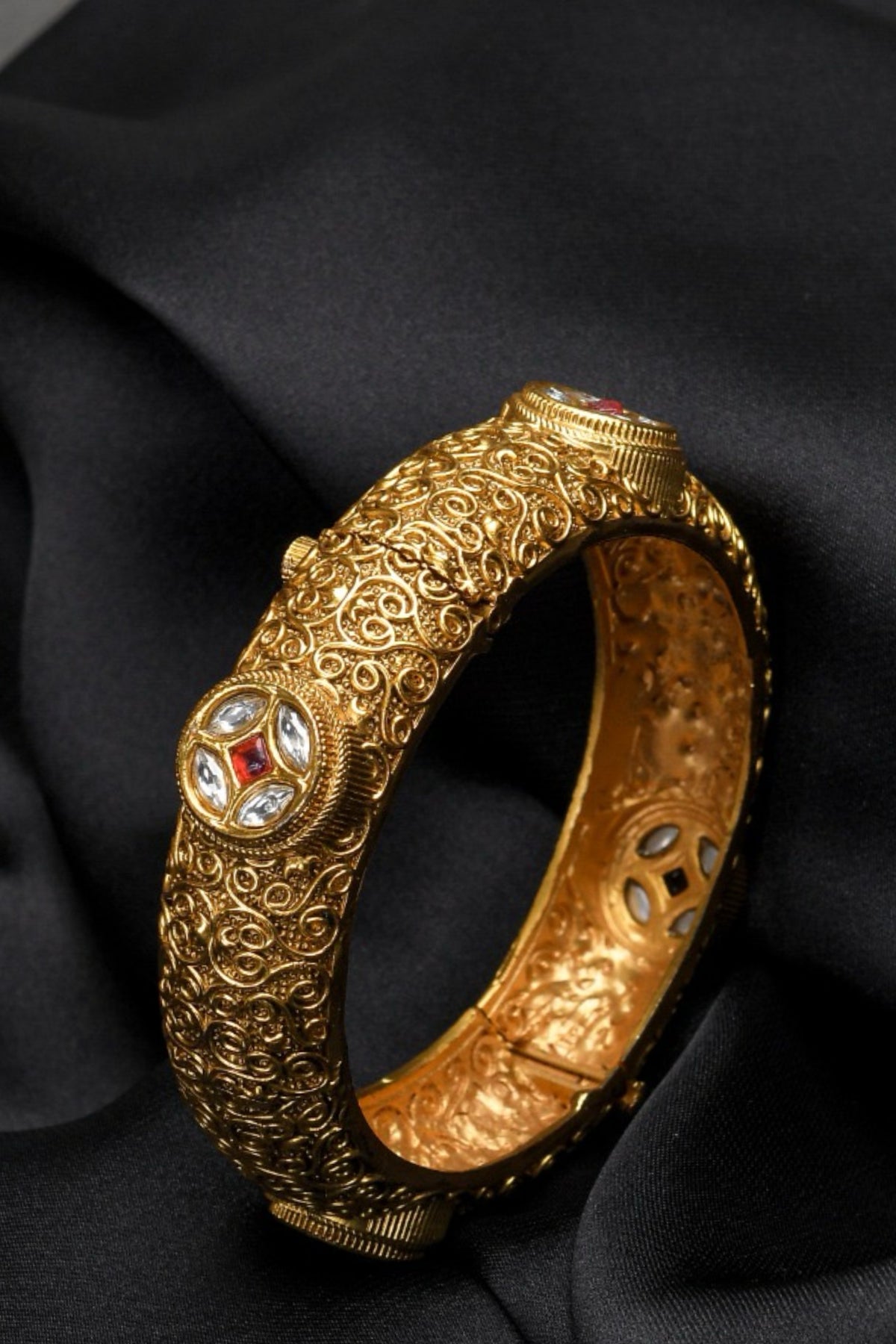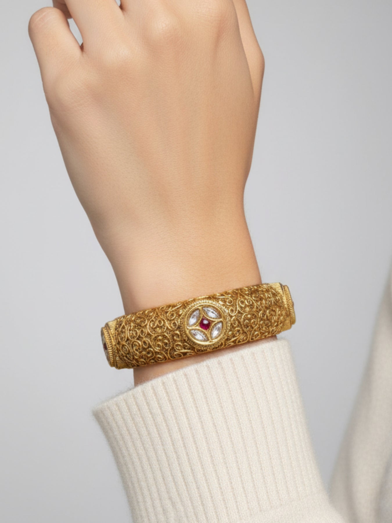 An ode to timeless grandeur — Buraaq embodies regal artistry through its intricate hand-carved detailing and rich gold finish. The deep red center stone framed by glistening polkis mirrors the essence of ancient craftsmanship reborn for the modern muse.