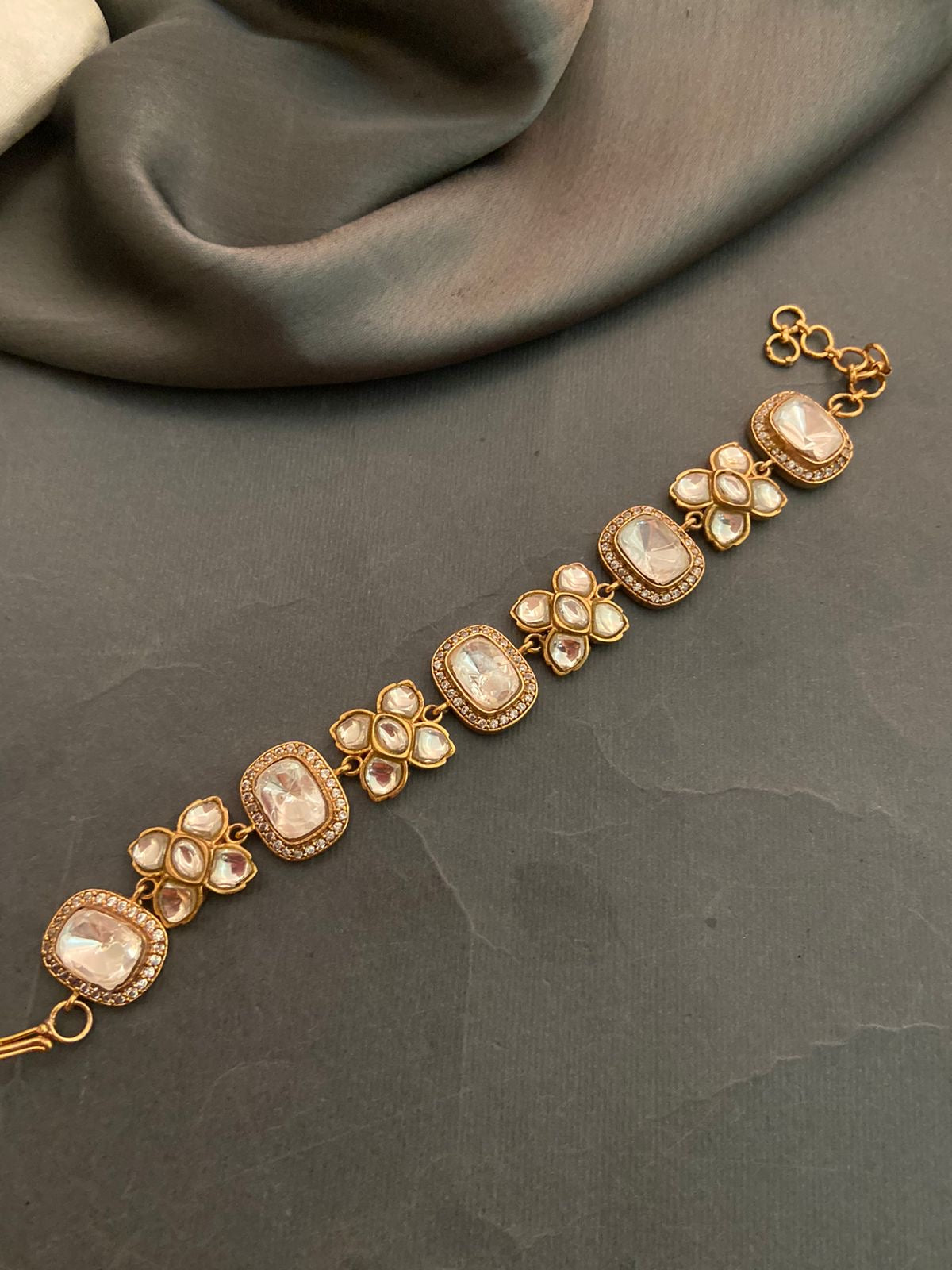 An ode to elegance made accessible. Emaan is adorned with uncut kundan-style stones framed in delicate crystal halos, accented by dainty floral motifs. Finished in 18k gold plating, this bracelet carries the essence of timeless heritage while fitting effortlessly into modern wardrobes.