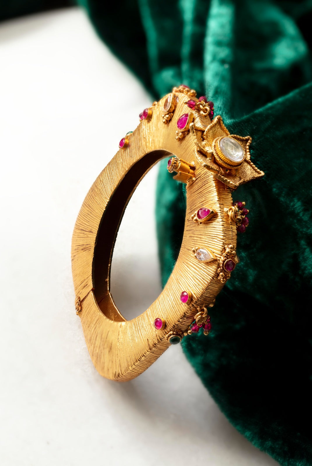 Material: Brass base, 18k antique gold plating, uncut polki, semi-precious rubies & emeralds