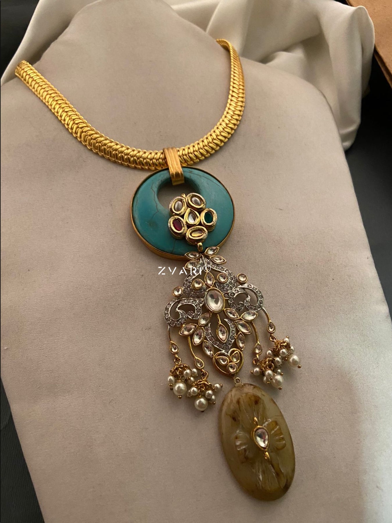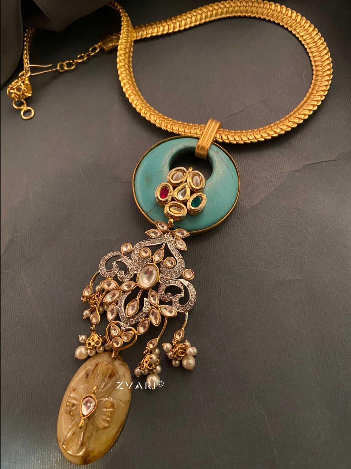 • Materials: Turquoise stone, kundan polki, ruby & green glass stones, honey onyx carved pendant, freshwater pearls, micro zircons