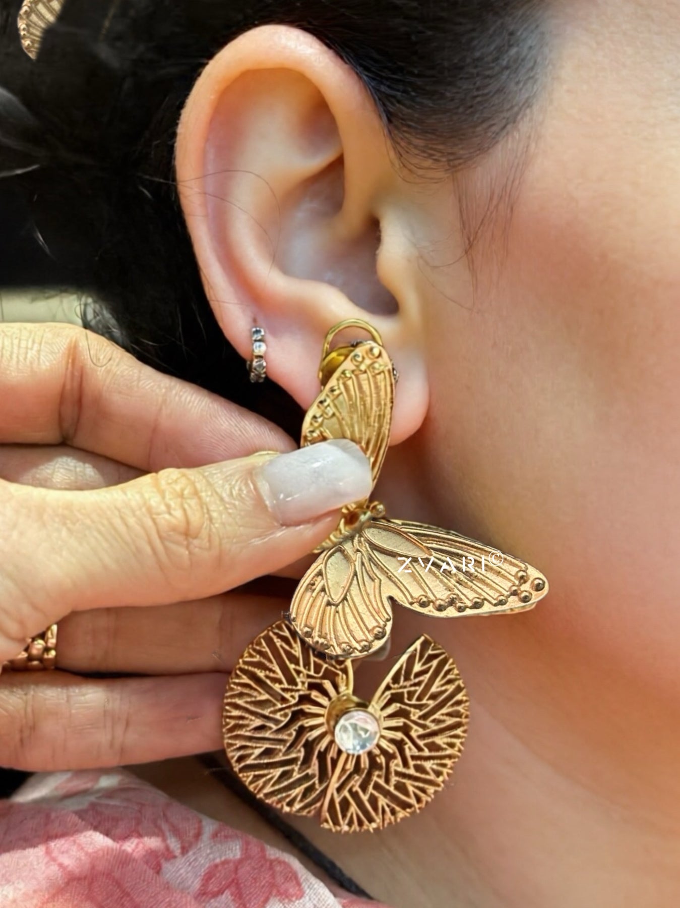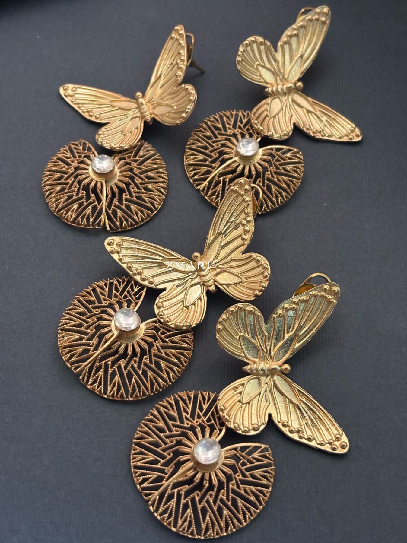 Where delicacy takes form and flight — these gold-plated statement earrings capture the beauty of transformation through intricately carved butterflies poised above textured filigree discs.