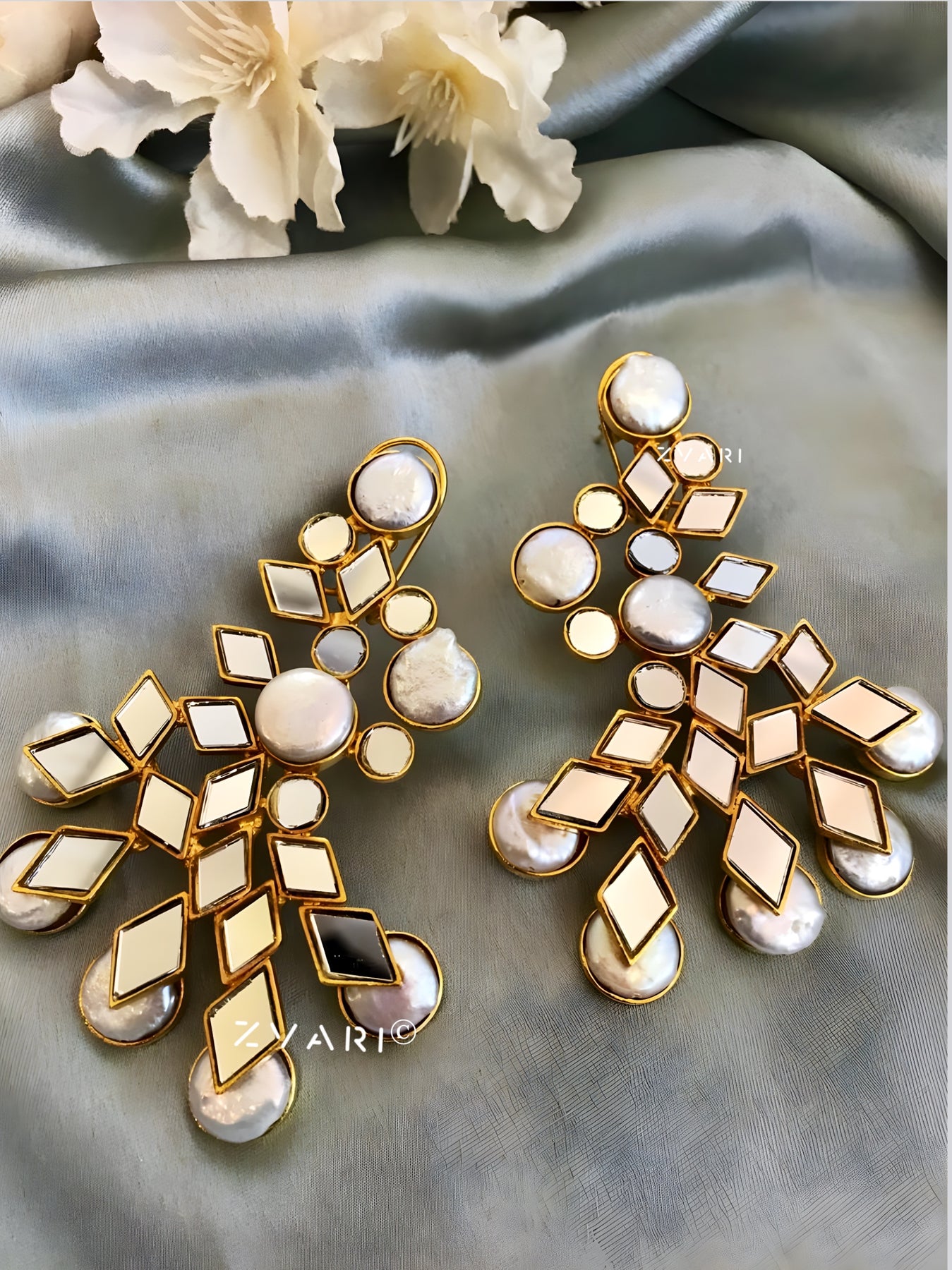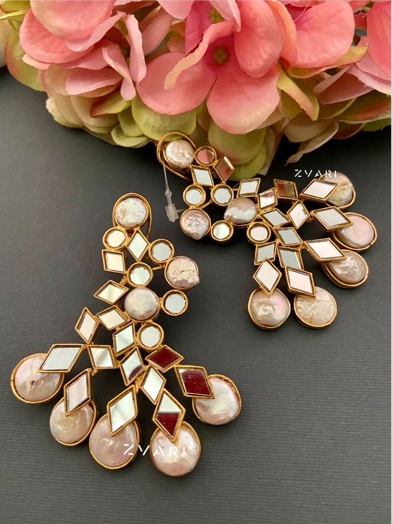 The elegant baroque pearl and mirror kundan beautifully put together in these 3 inches long statement earrings.