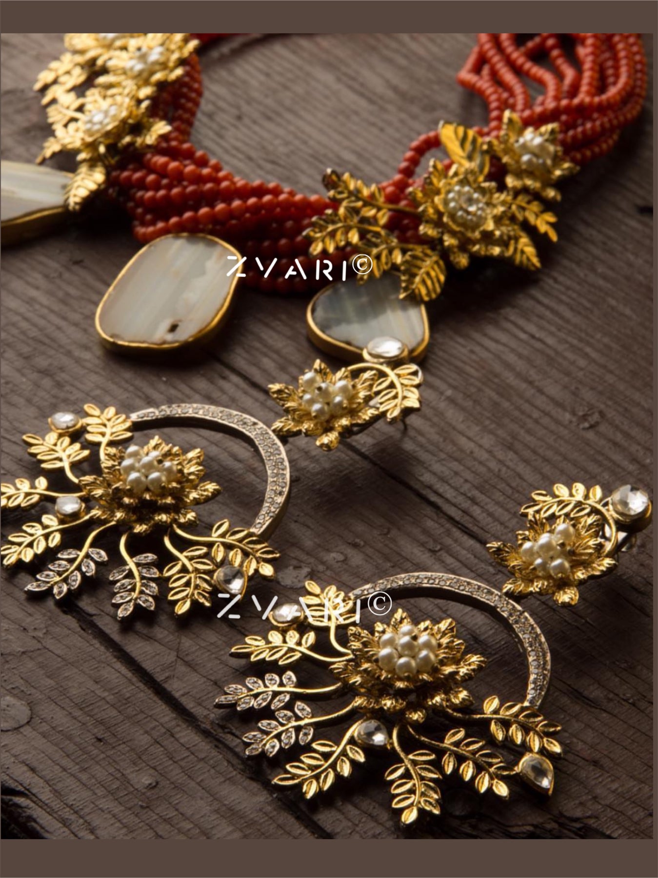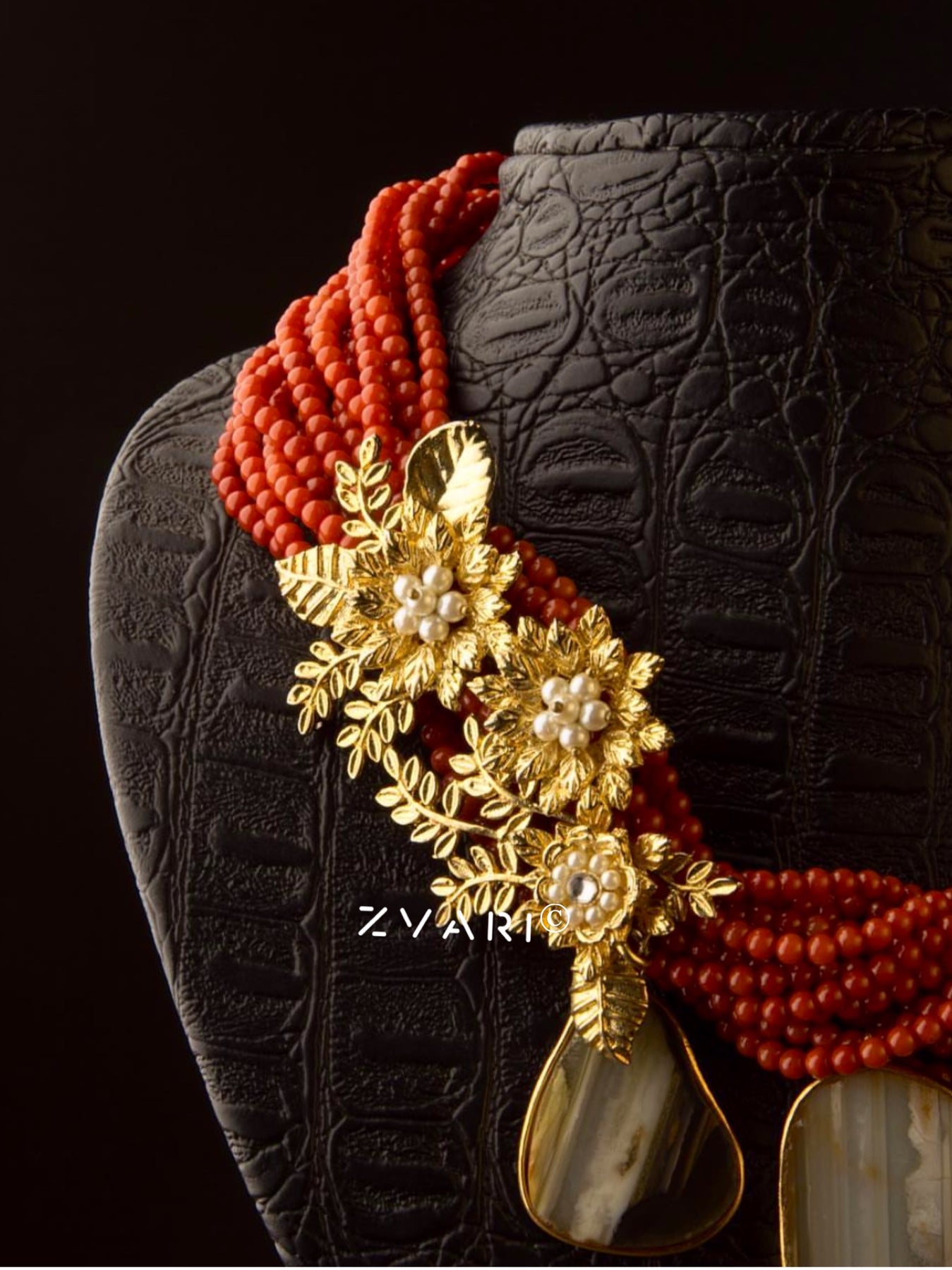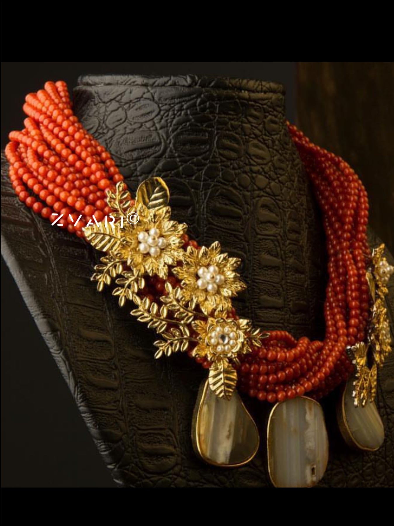 Striking and sophisticated, this statement neckpiece features multiple strands of deep coral-red beads, creating a rich and layered silhouette. The centerpiece is adorned with intricate floral motifs crafted in gold-tone metal, accented with clusters of pearls and delicate foliage. Bold natural stone drops add an earthy elegance, perfectly balancing the vibrancy of the beads with organic texture. A modern heirloom that celebrates craftsmanship and nature’s beauty — perfect for festive occasions or luxe styling (Neckpiece only )