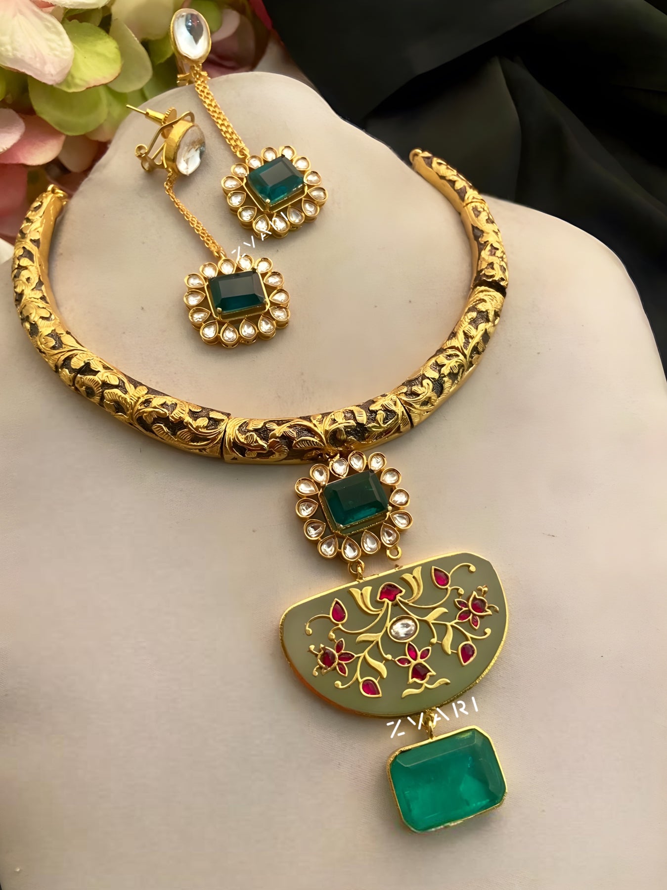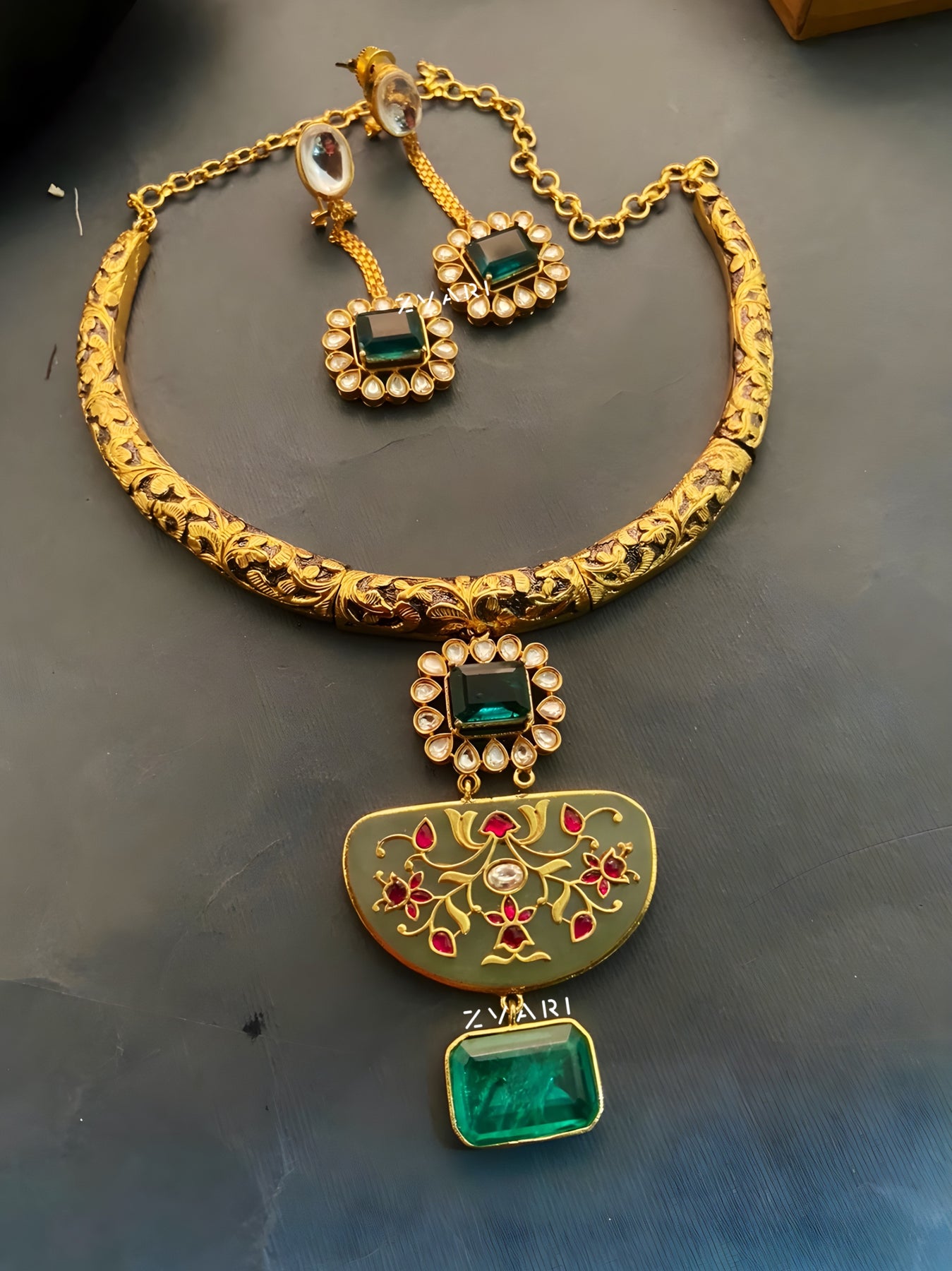Z'Adore is perfected in its designs by embellished ruby stone and emerald doublet. This one of a kind statement piece has self carved necklace with Kundan, doublet and peridot pendant.