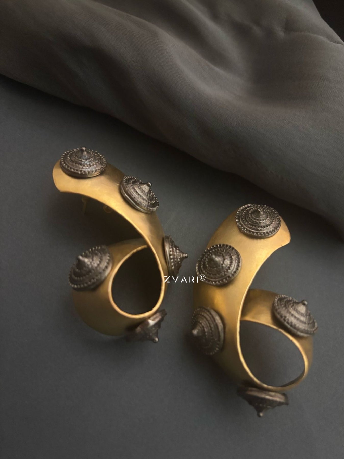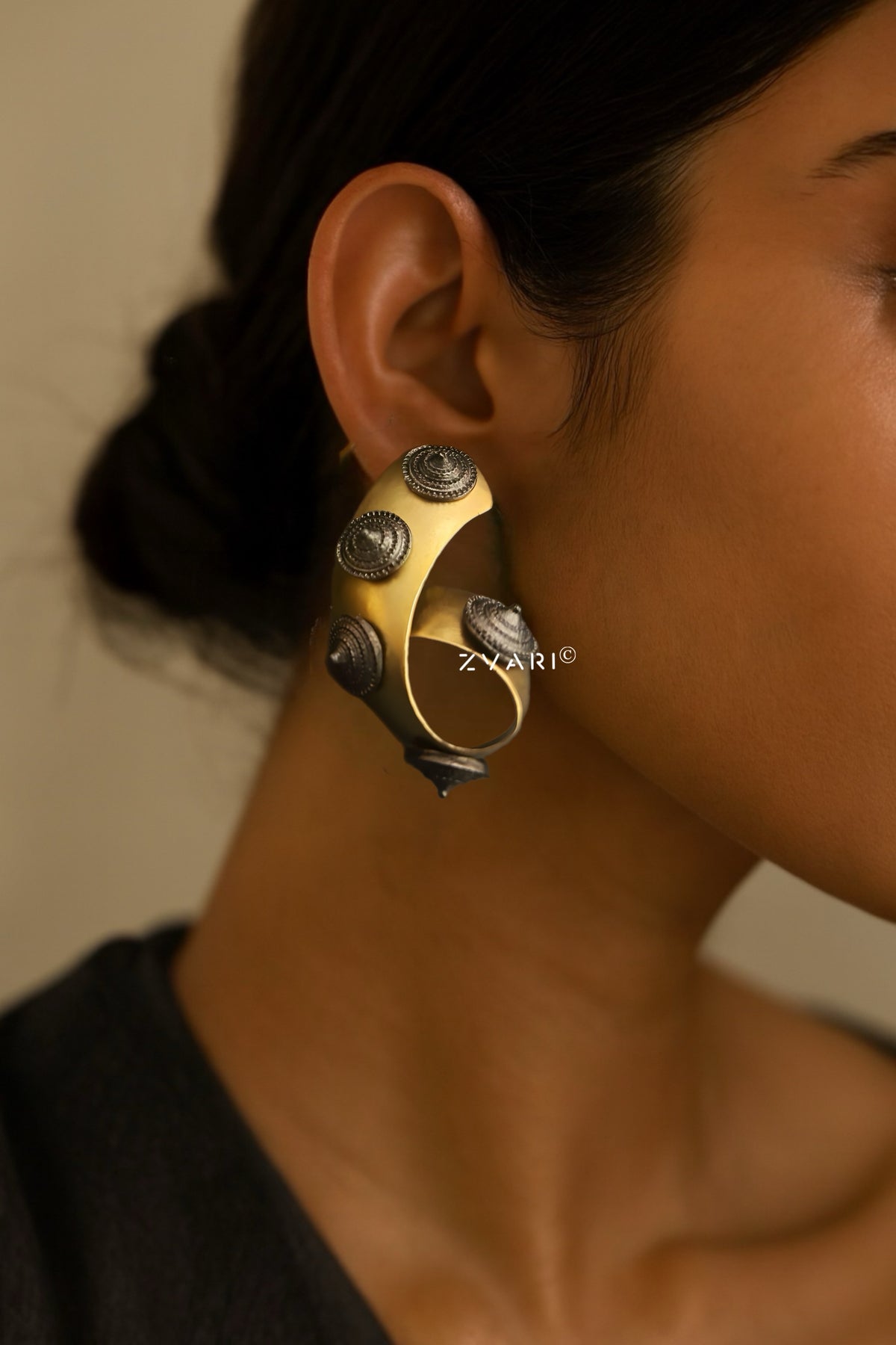 Fierce, fluid, and unapologetically sculptural — Z’s Fierce is a tribute to warrior grace and ancestral power. Crafted in a twisted matte gold form and adorned with tribal-inspired oxidized domes, these statement hoops echo the strength of ancient armor reimagined for the modern muse. Bold yet versatile, they elevate both crisp tailoring and draped silks with effortless authority. Designed to stand alone, Z’s Fierce channels bold femininity with a fire that’s both timeless and untamed.